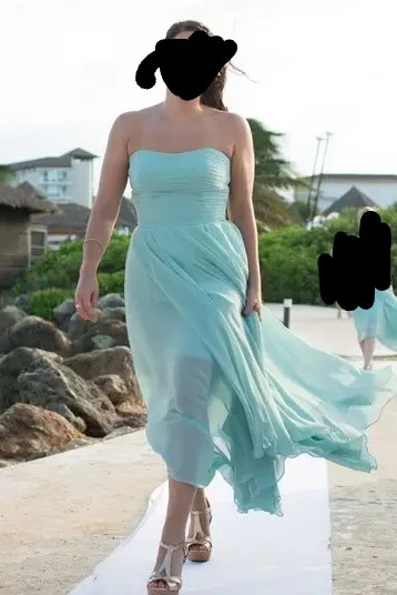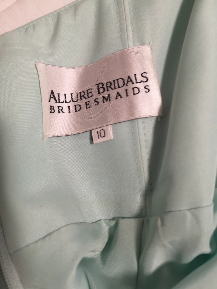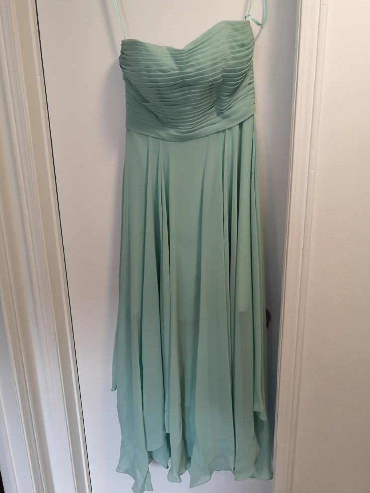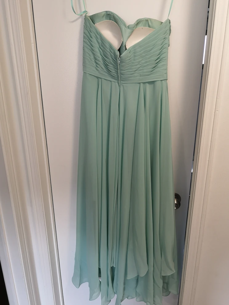378Beautiful strapless bridesmaid dress worn once. Size 10 but was taken in at waist. Breast cups were added. Clasp at back broken but zipper stays up without it. Colour is called waterfall.