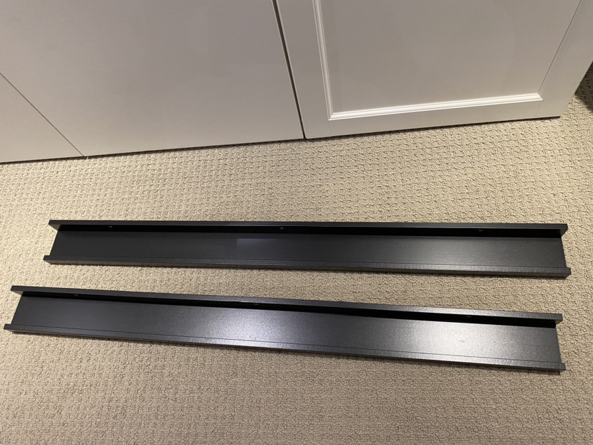 Dark brown wooden shelves for displaying picture frames and artwork.