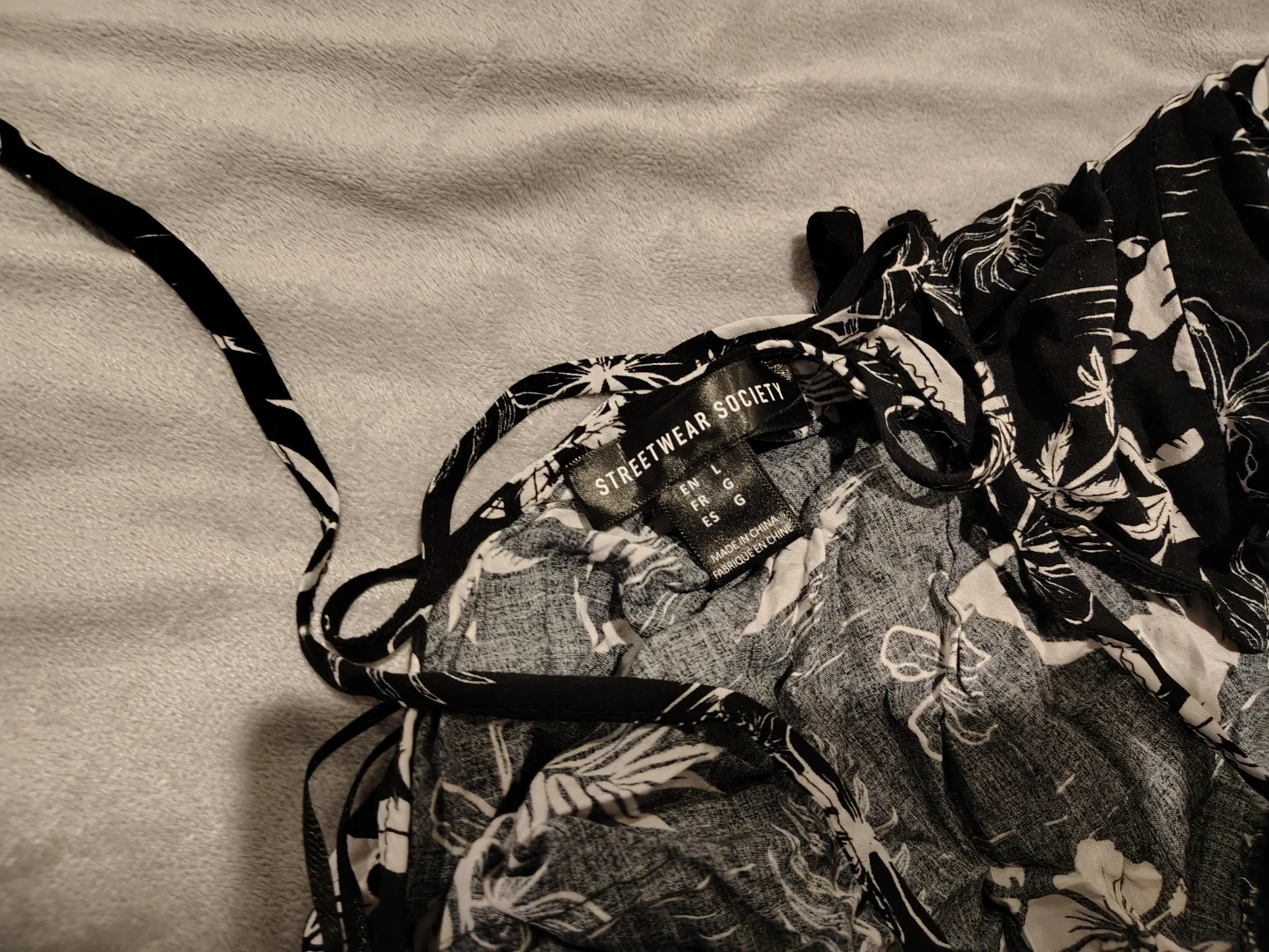 This black halter dress features a tropical floral and palm tree print. It's a size large with adjustable tie straps. Lightweight fabric for warm weather. Perfect for summer outings! Fits more like a medium.