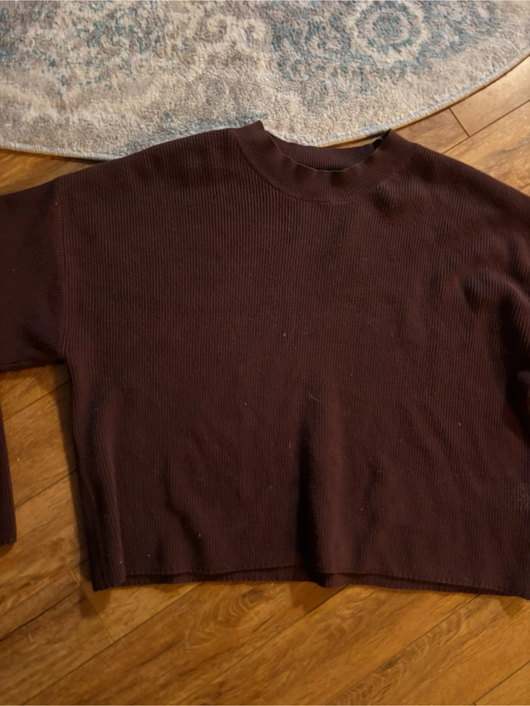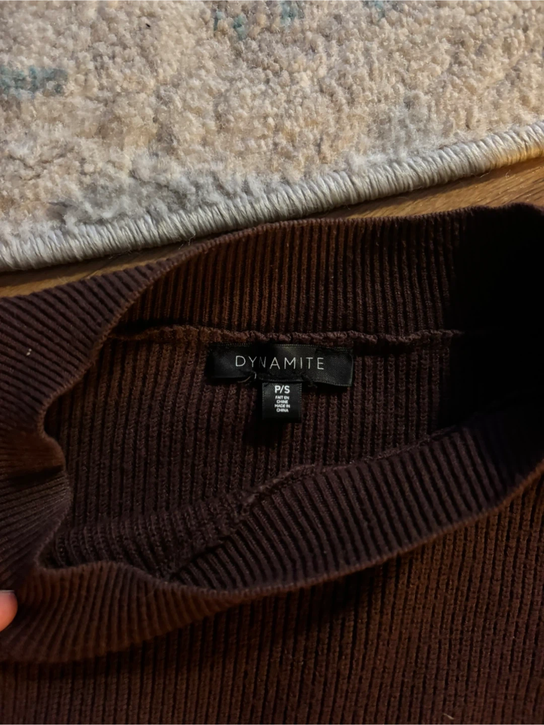 A brown ribbed cropped sweater from Dynamite. It's a size P/S with a mock neck and long sleeves.