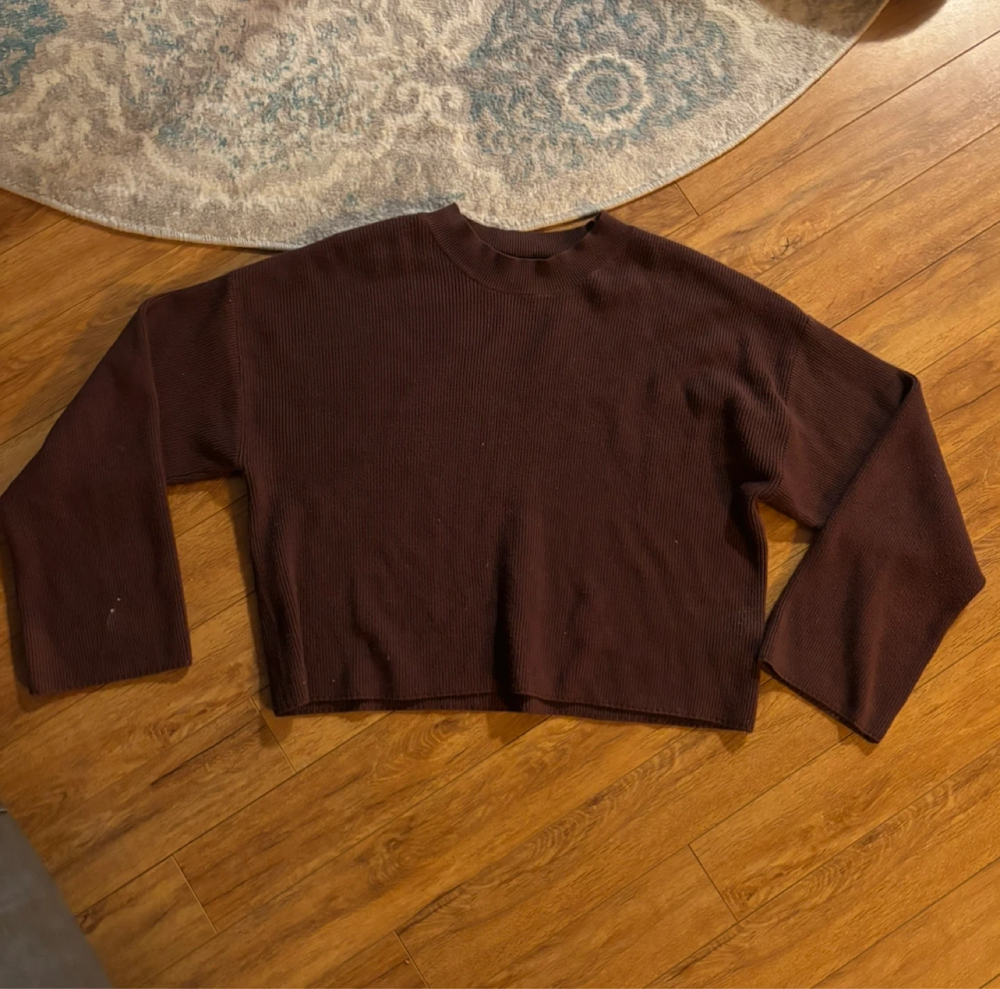 A brown ribbed cropped sweater from Dynamite. It's a size P/S with a mock neck and long sleeves.