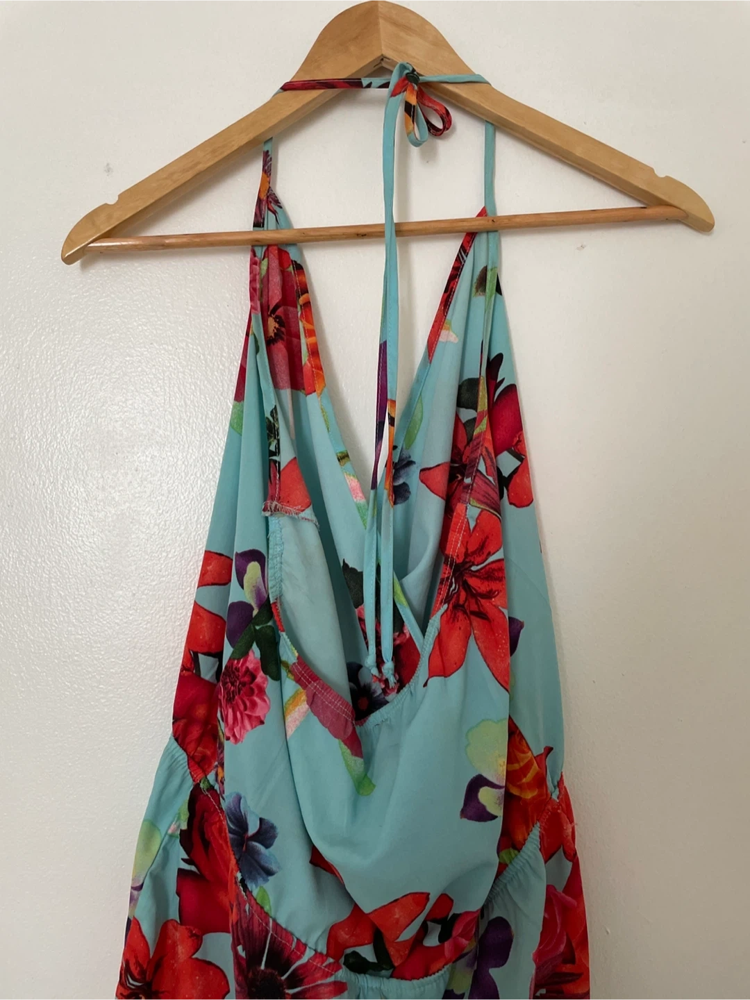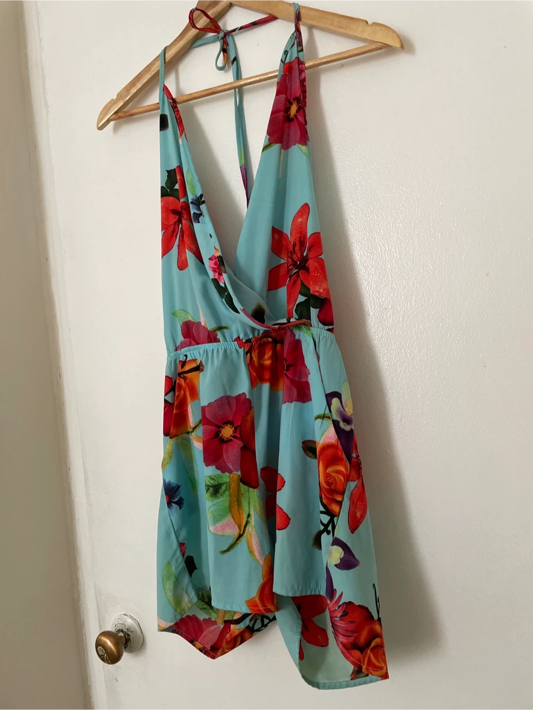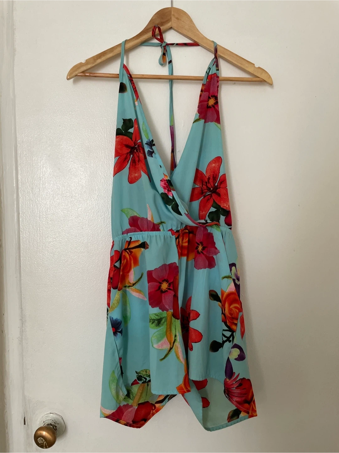 Light blue romper with a vibrant floral print. It features a halter neckline and a cinched waist. Size is small. Great condition. Only worn a few times.