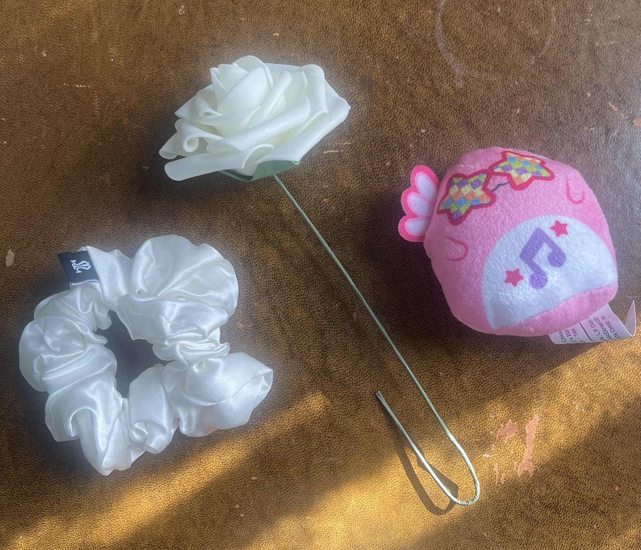 White silk scrunchie from Lilysilk White flower - donated Plushie toy - was a Happy meal toy Free to use! I need to declutter.