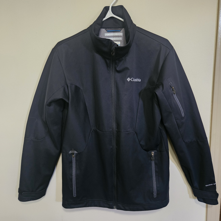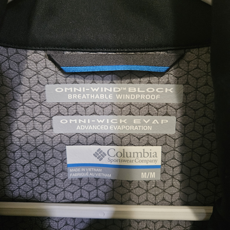 Selling a Columbia black jacket in size medium. It features Omni-Wind Block technology, making it breathable and windproof. It also has Omni-Wick Evap for advanced evaporation. Great for outdoor activities!