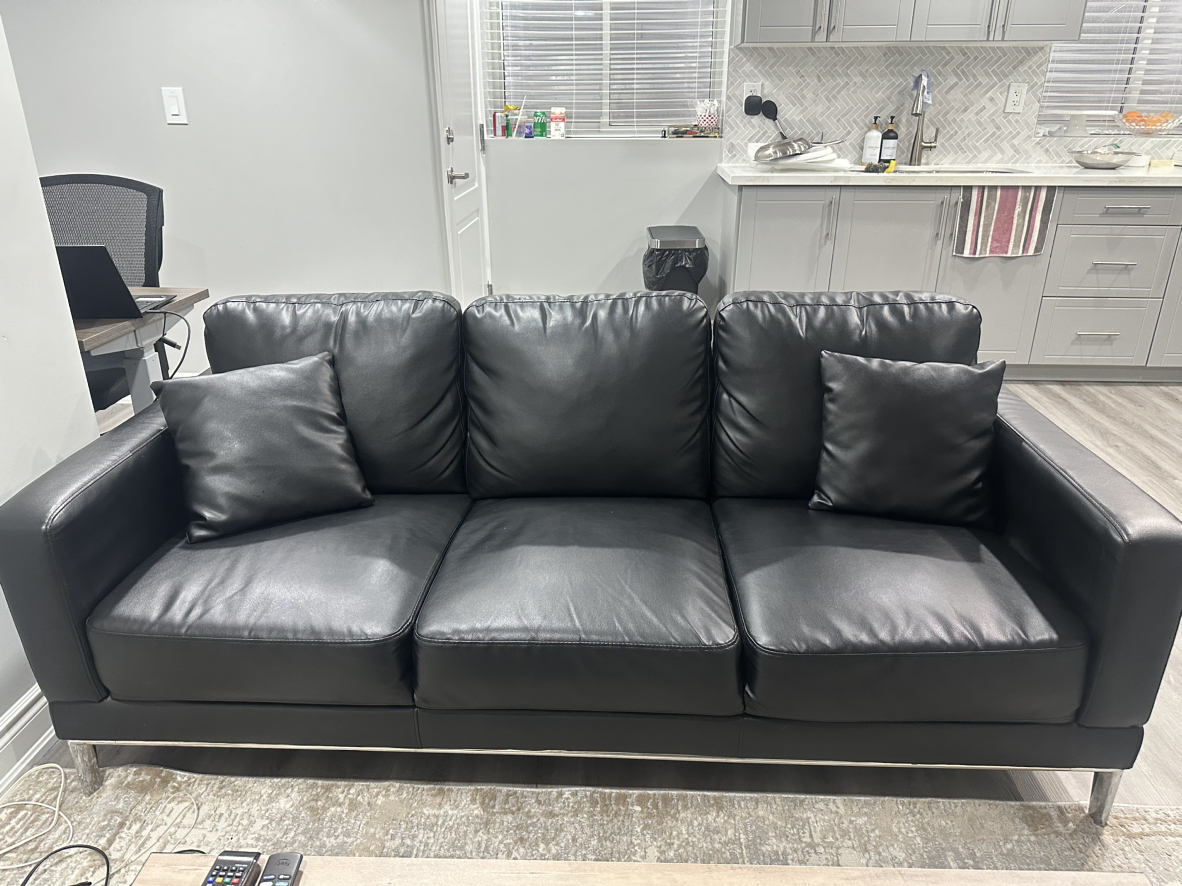 Black leather couch from Structube. Has been used, however in great condition. Comes with two black leather pillows. Very sleek and comfortable. Good size.