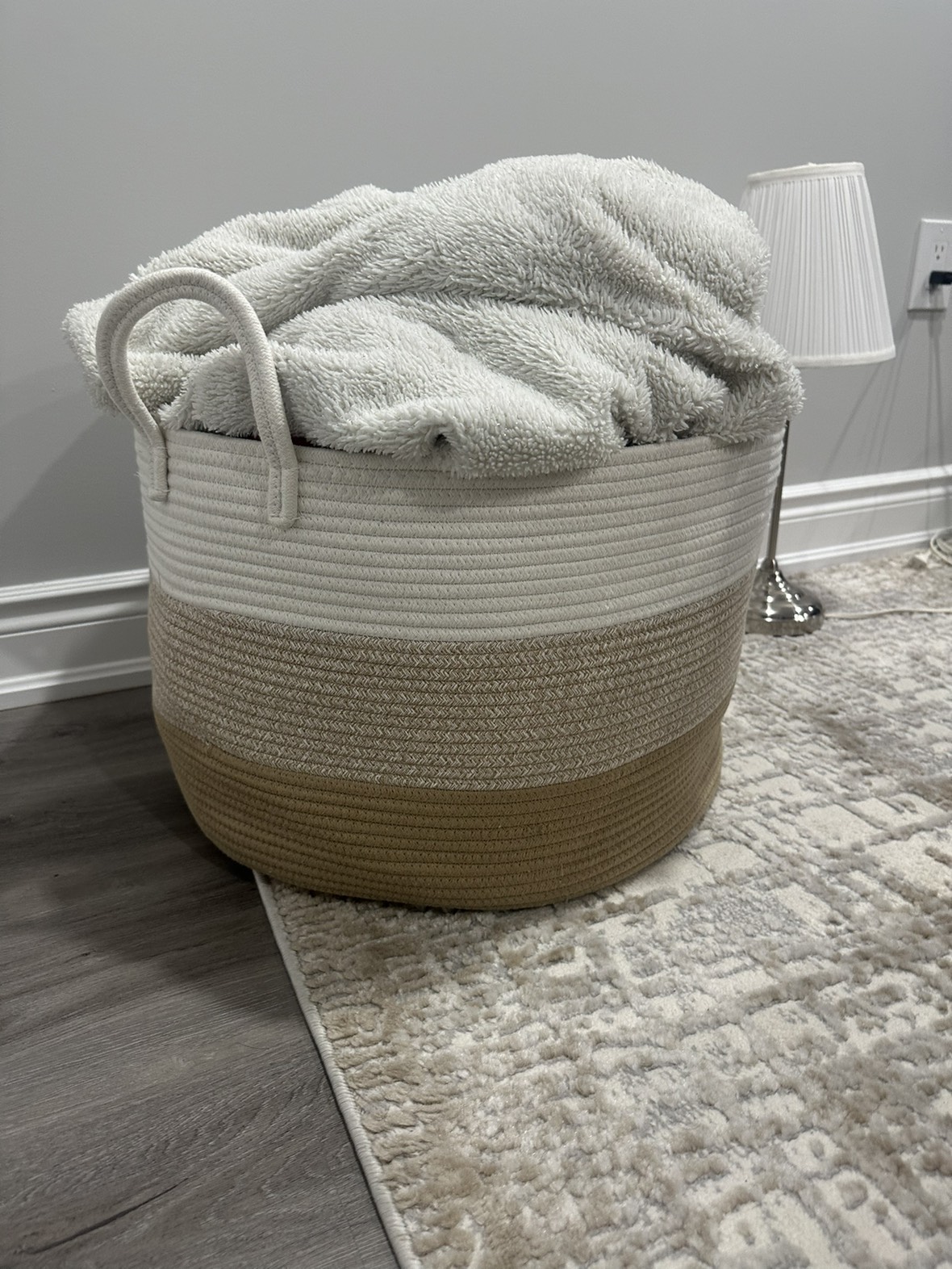 Rope Basket that is three toned coloured. Has handles to hold. Can be used for blankets, laundry, clothing, etc. Great storage basket for organizing. Excellent condition. Barely used. Fairly new as well.