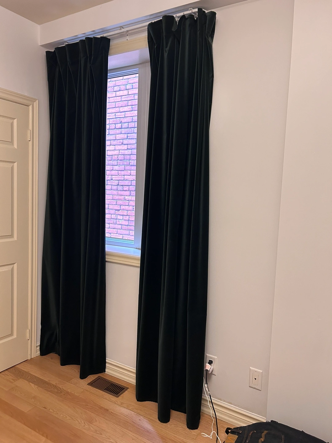 Room darkening dark green velvet curtains. Can be used on a rail or with hooks.