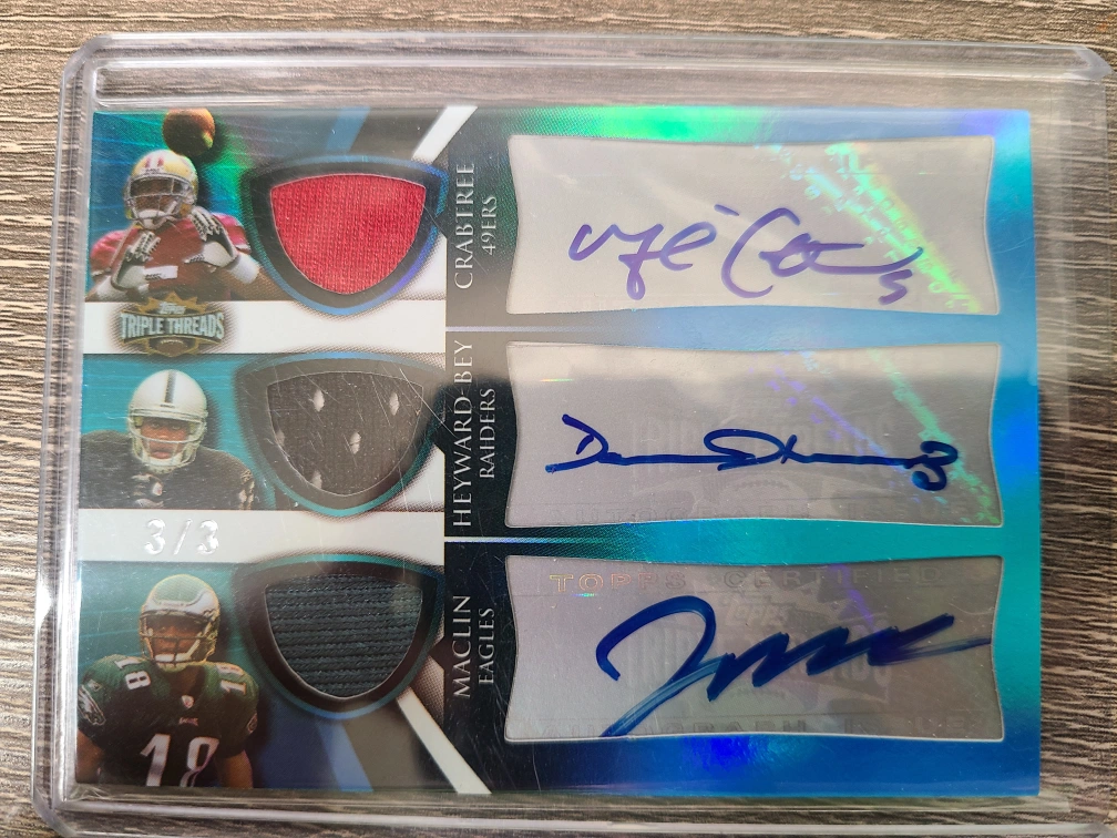 2009 Topps Triple Threads NFL Rookie Premiere. Michael Crabtree , Darrius Heyward Bey and Jeremy Maclin Rookie Patch Auto Card. 3/3 $80 pickup is in Binbrook or shipping available at buyers expense.