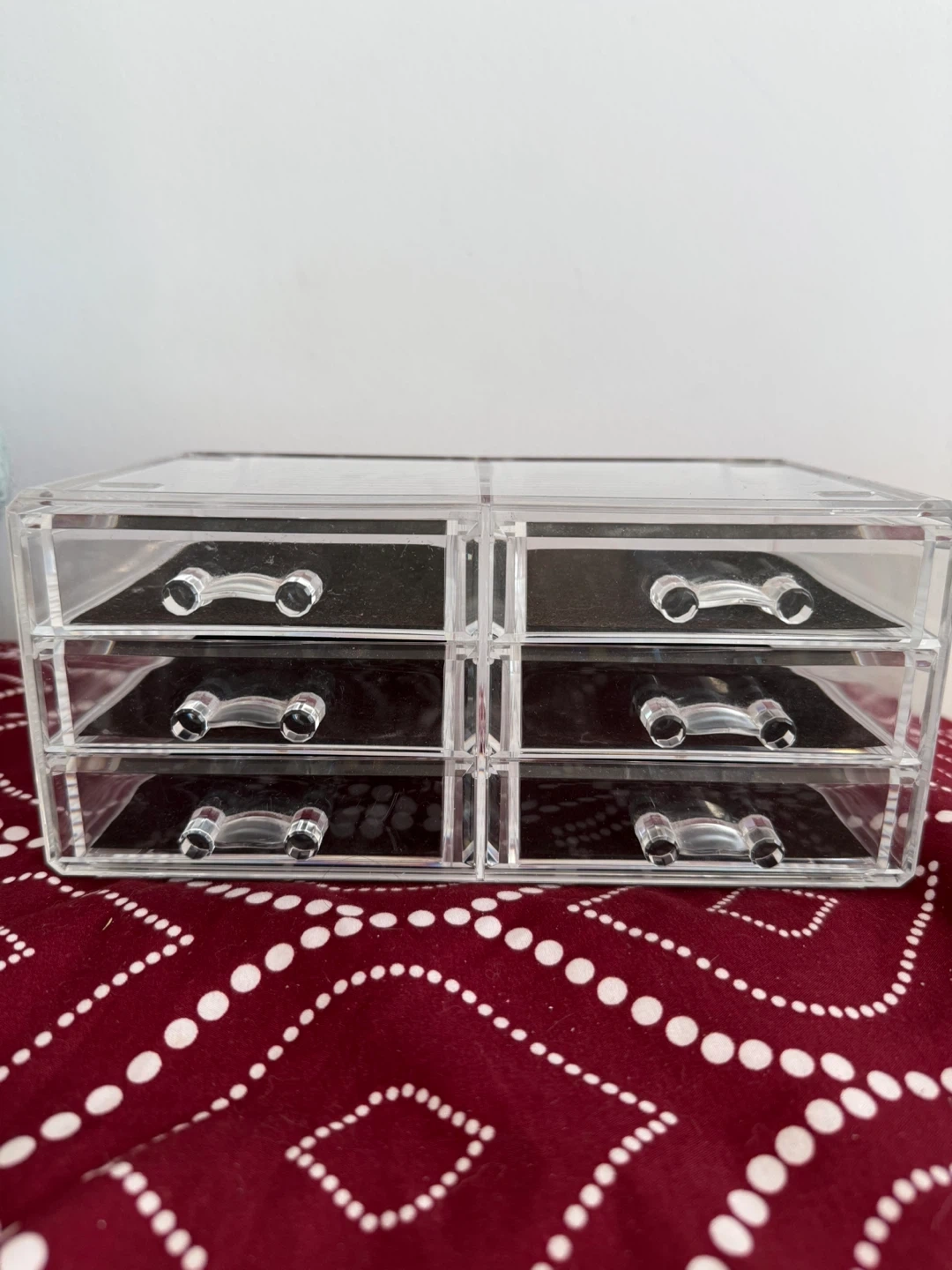 Clear acrylic makeup organizer with six drawers. It's great for storing cosmetics and accessories. The drawers offer easy access to your beauty essentials.