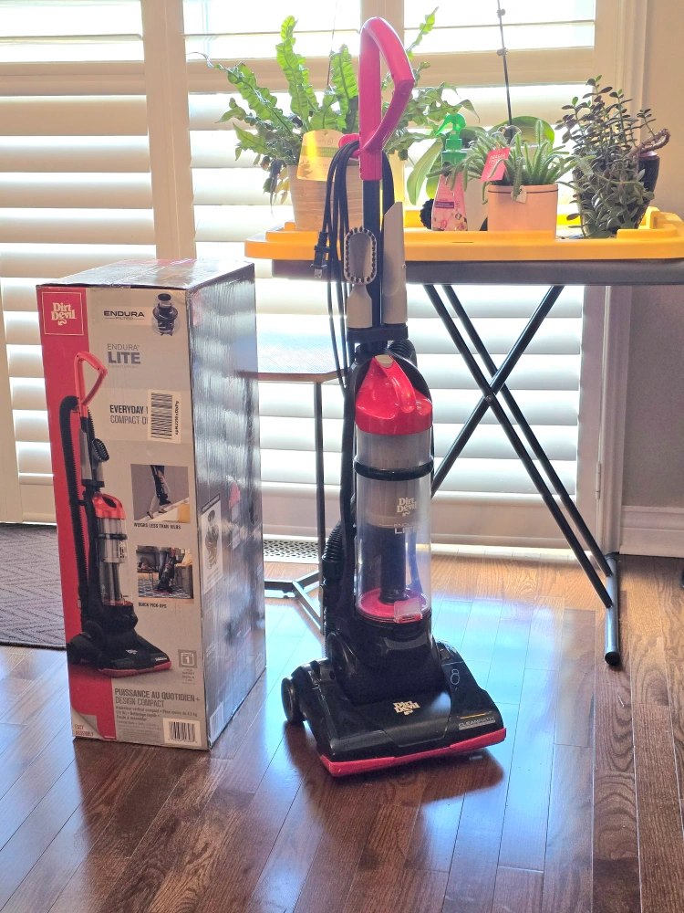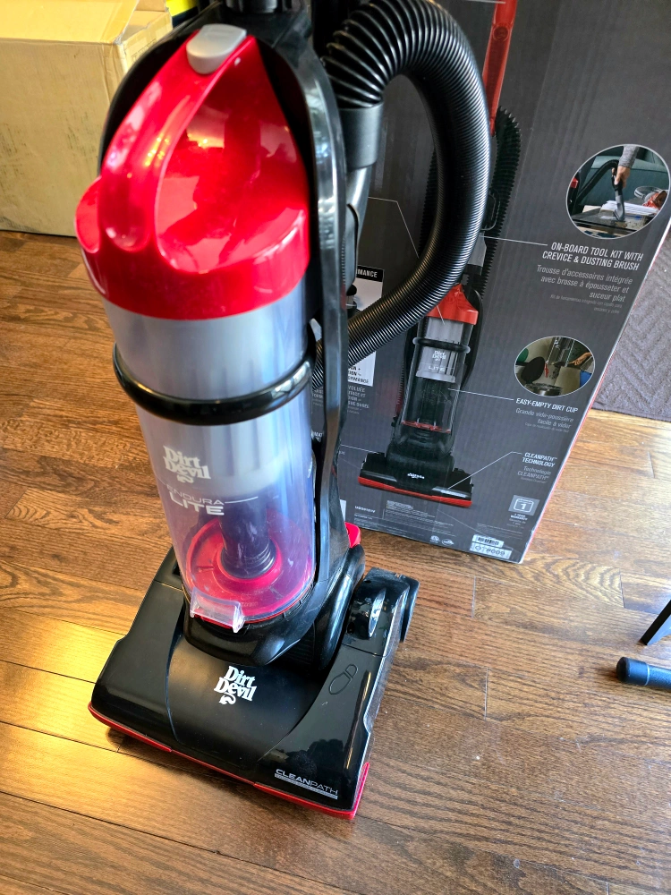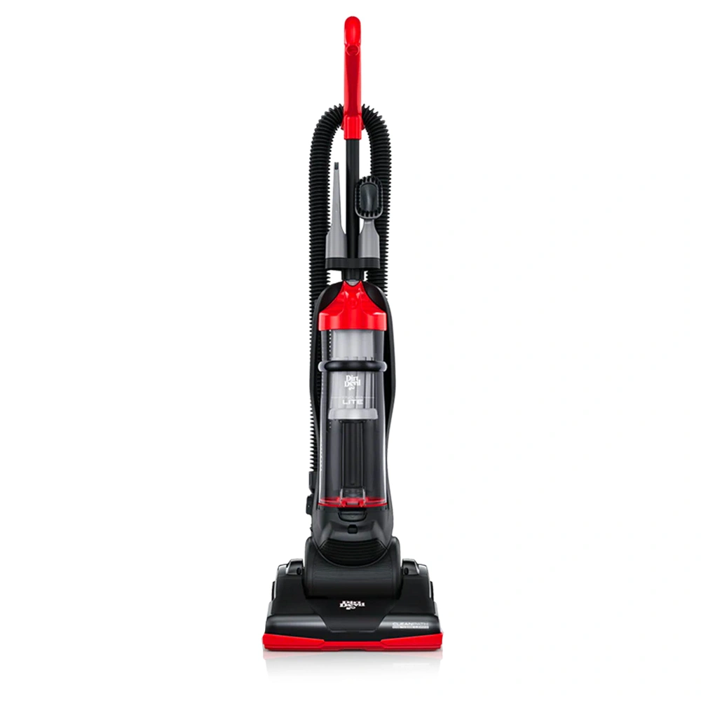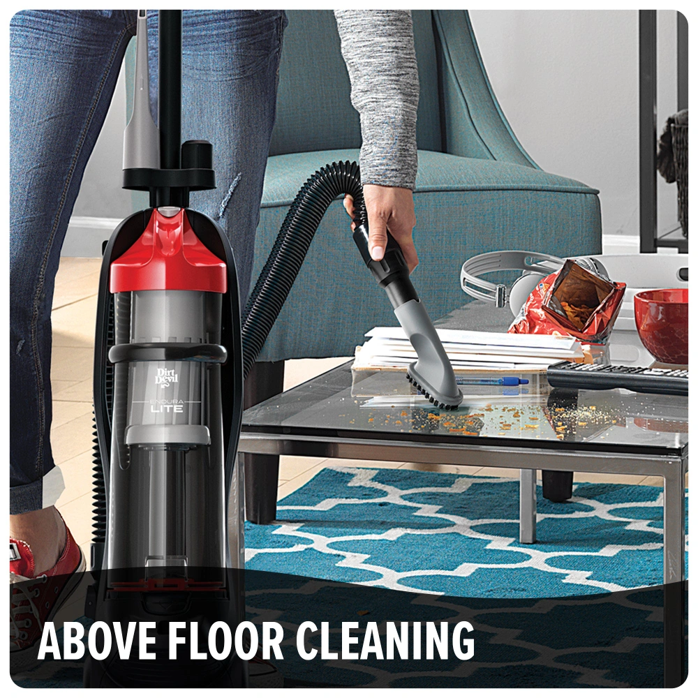 - Weighing less than 9 pounds, the Dirt Devil Endura Lite Upright Vacuum can easily power through messes in-between furniture, under your bed, and any other tight spaces. The three-stage Endura filtration system gives you a deep, effective clean for Advanced Performance with long-lasting, no loss of suction. Plus, use the above floor extended cleaning hose and crevice tool to tackle debris on your coffee table and other above floor spaces. Wrap up your clean with the touch of a button to empty your dirt cup while never touching the dirt.