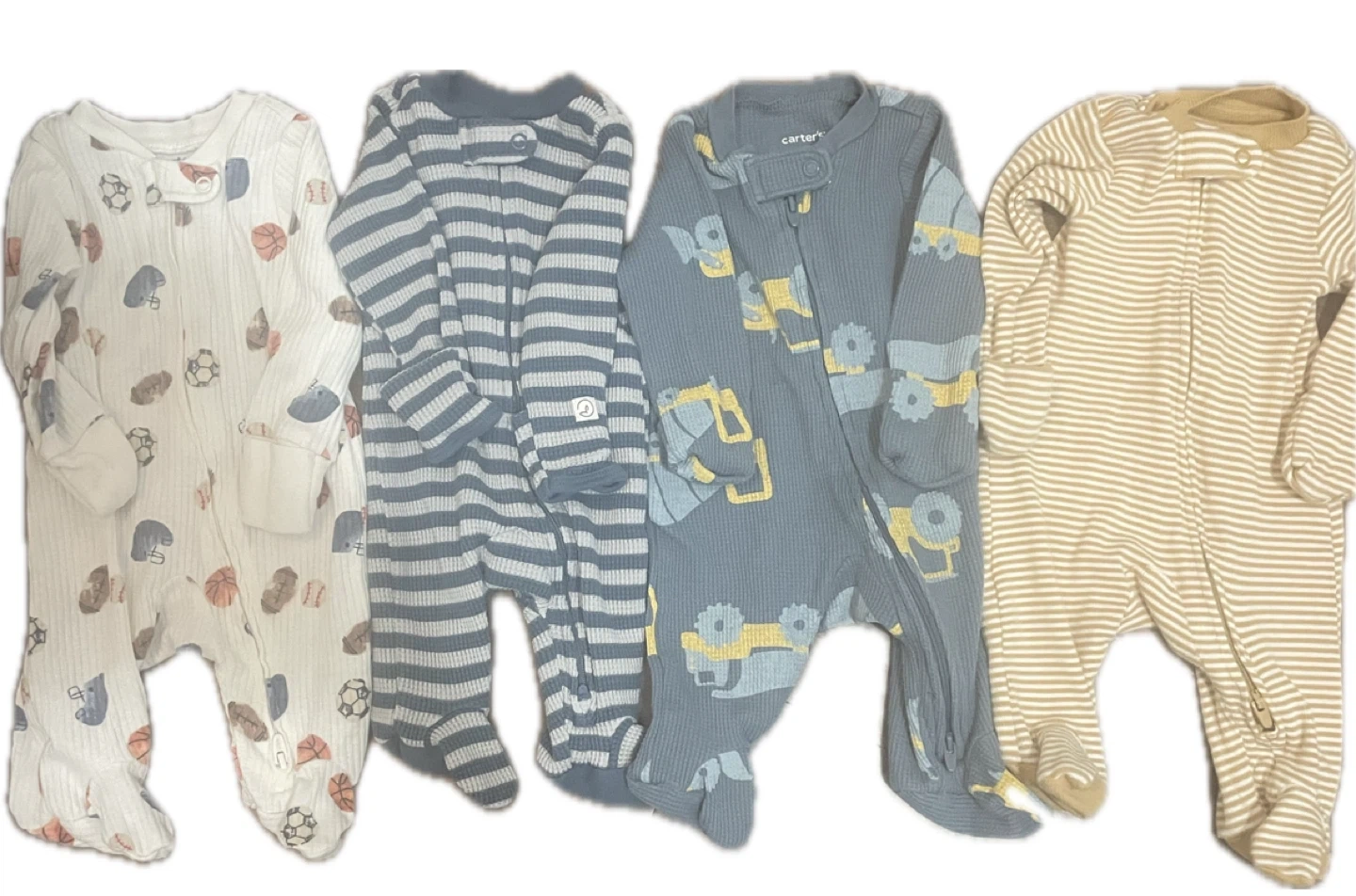 Also, two Little Planet organic sleepers, one with sports balls and one with stripes. All are size newborn (). Zip-up closure for easy changes.