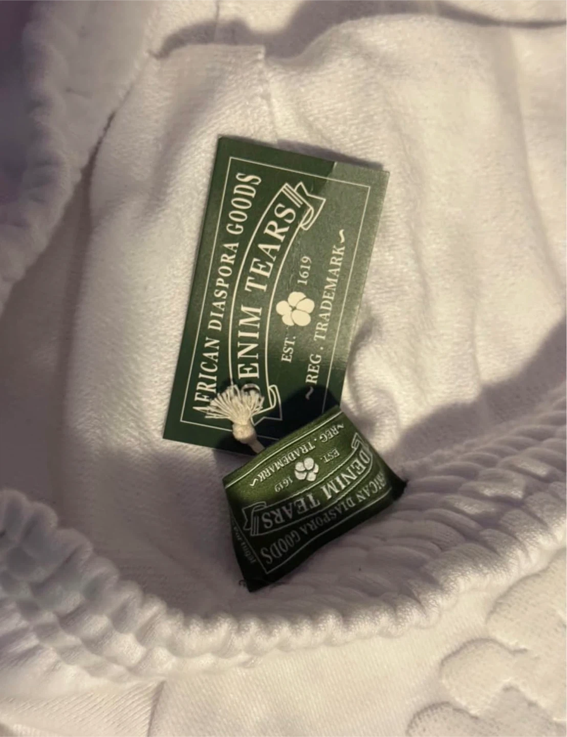 White denim tears shorts with embossed cloud detailing. These shorts feature a drawstring waist and a relaxed fit. Perfect for casual wear.