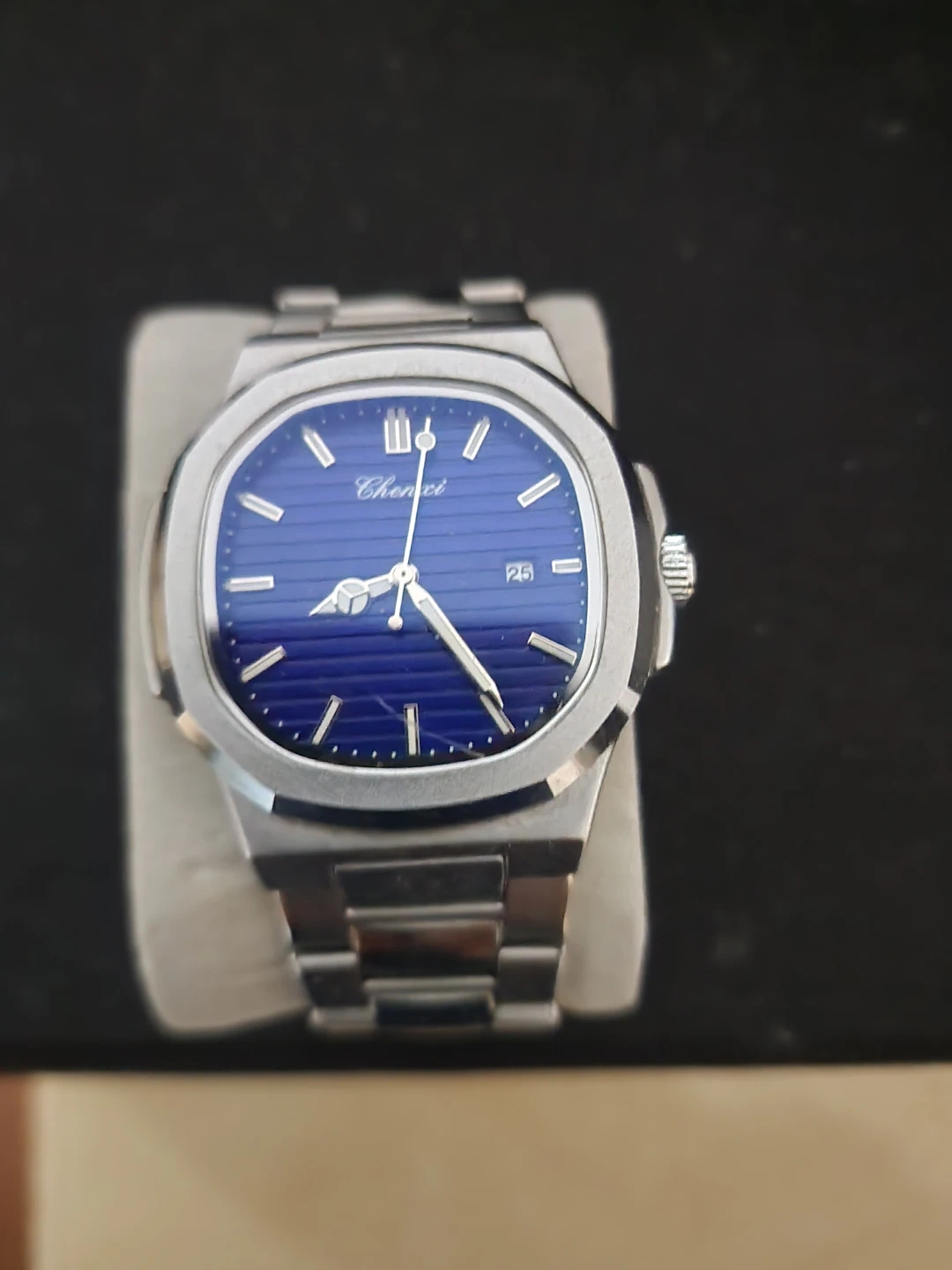 This is a Chenxi men's watch. It features a blue dial with silver-tone hour markers and a date window. The watch has a stainless steel band and casing.