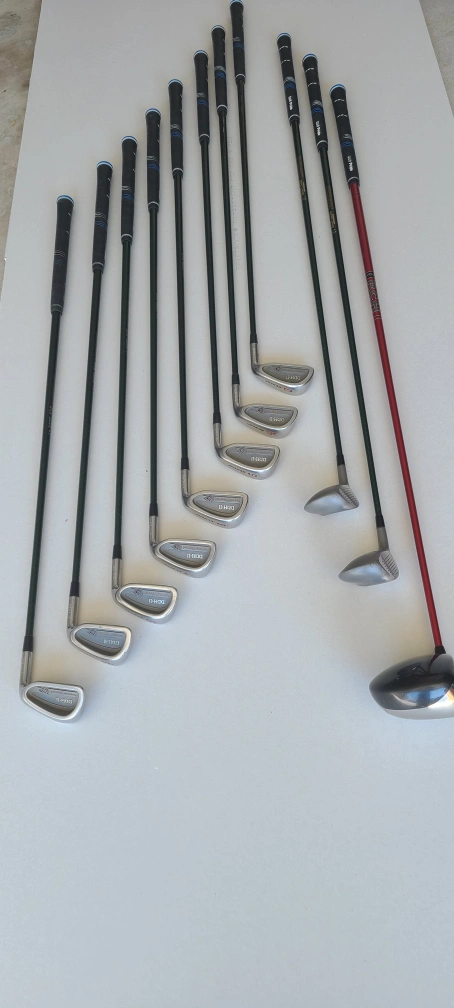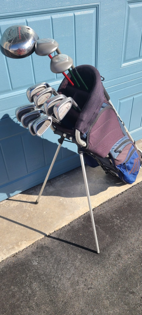 For Sale: set of golf clubs and bag $200. Dunlop irons DDH11, 3-9, PW, perimeter weighted, #3 & #5 woods, all graphite mid-firm shafts, good shape; driver Callaway Big Bertha 454cc, 10 deg. loft (sm. scuff on head), three head covers; Mizuno stand bag w/carry strap. Bonus: one Titleist ProV1x golf ball.