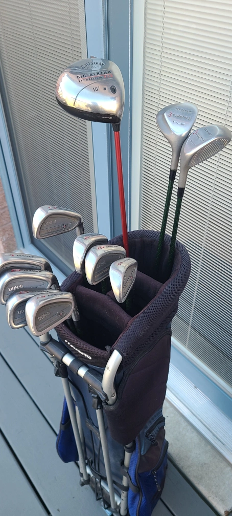 For Sale: set of golf clubs and bag $200. Dunlop irons DDH11, 3-9, PW, perimeter weighted, #3 & #5 woods, all graphite mid-firm shafts, good shape; driver Callaway Big Bertha 454cc, 10 deg. loft (sm. scuff on head), three head covers; Mizuno stand bag w/carry strap. Bonus: one Titleist ProV1x golf ball.