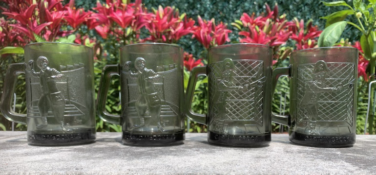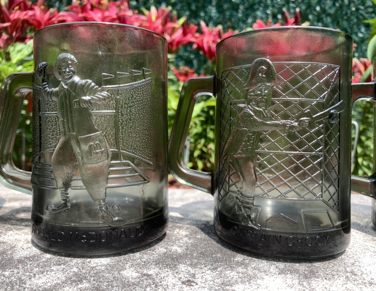 10Two pairs of vintage, never used 1970s McDonalds smokey gray glass mugs. It’s a pair of Ronald throwing a football & a pair of Captain Cook hitting a baseball.