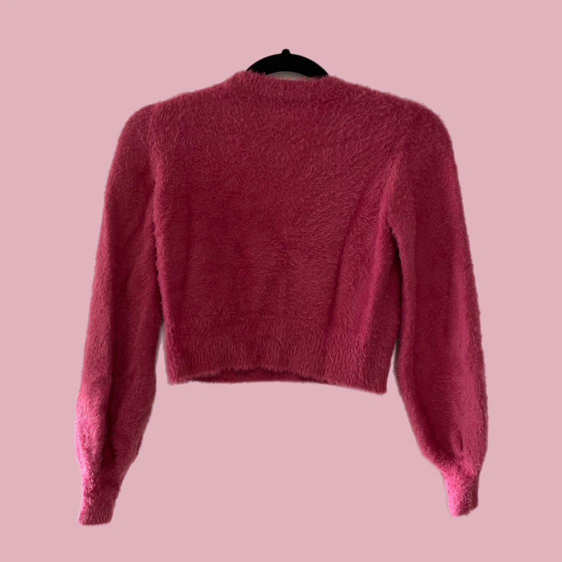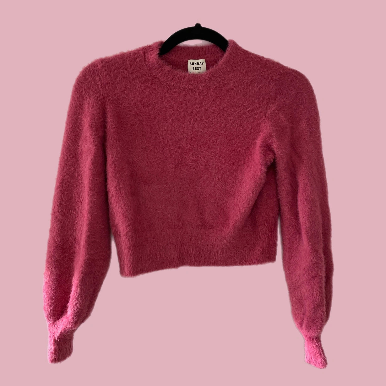 Fuzzy long sleeve elastic pink cropped sweater. It is ridiculously soft, comfortable and flattering. Bought at Aritzia
