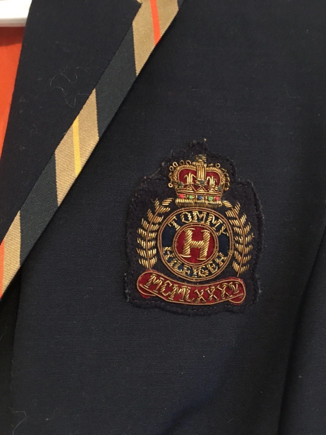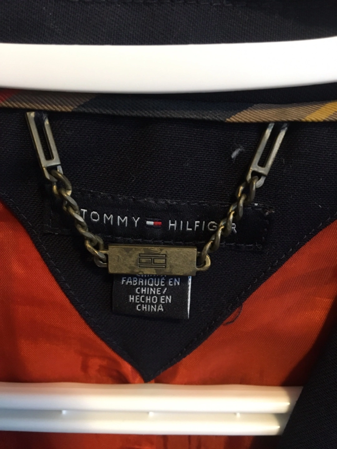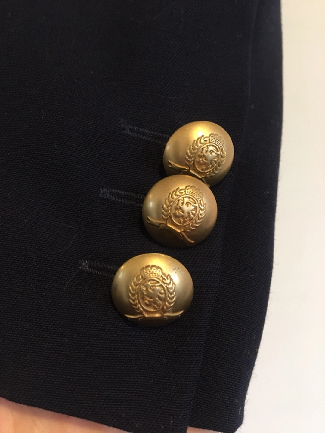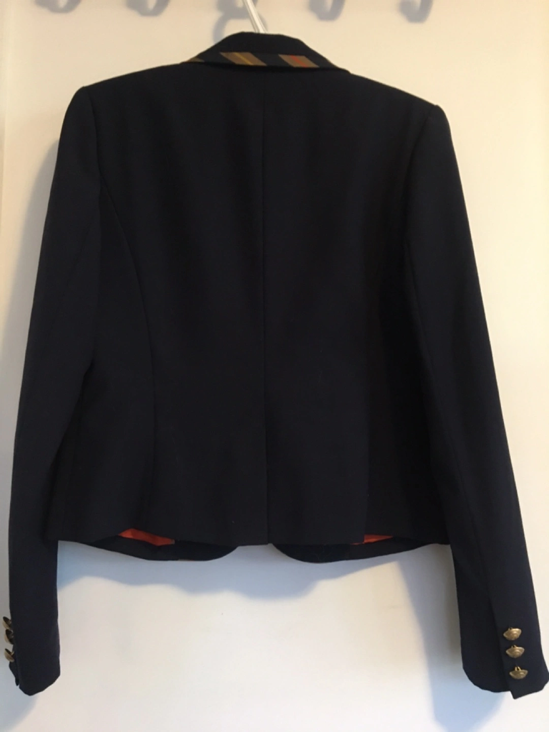 Women's navy blazer. Features gold buttons, orange lining, and striped detailing.