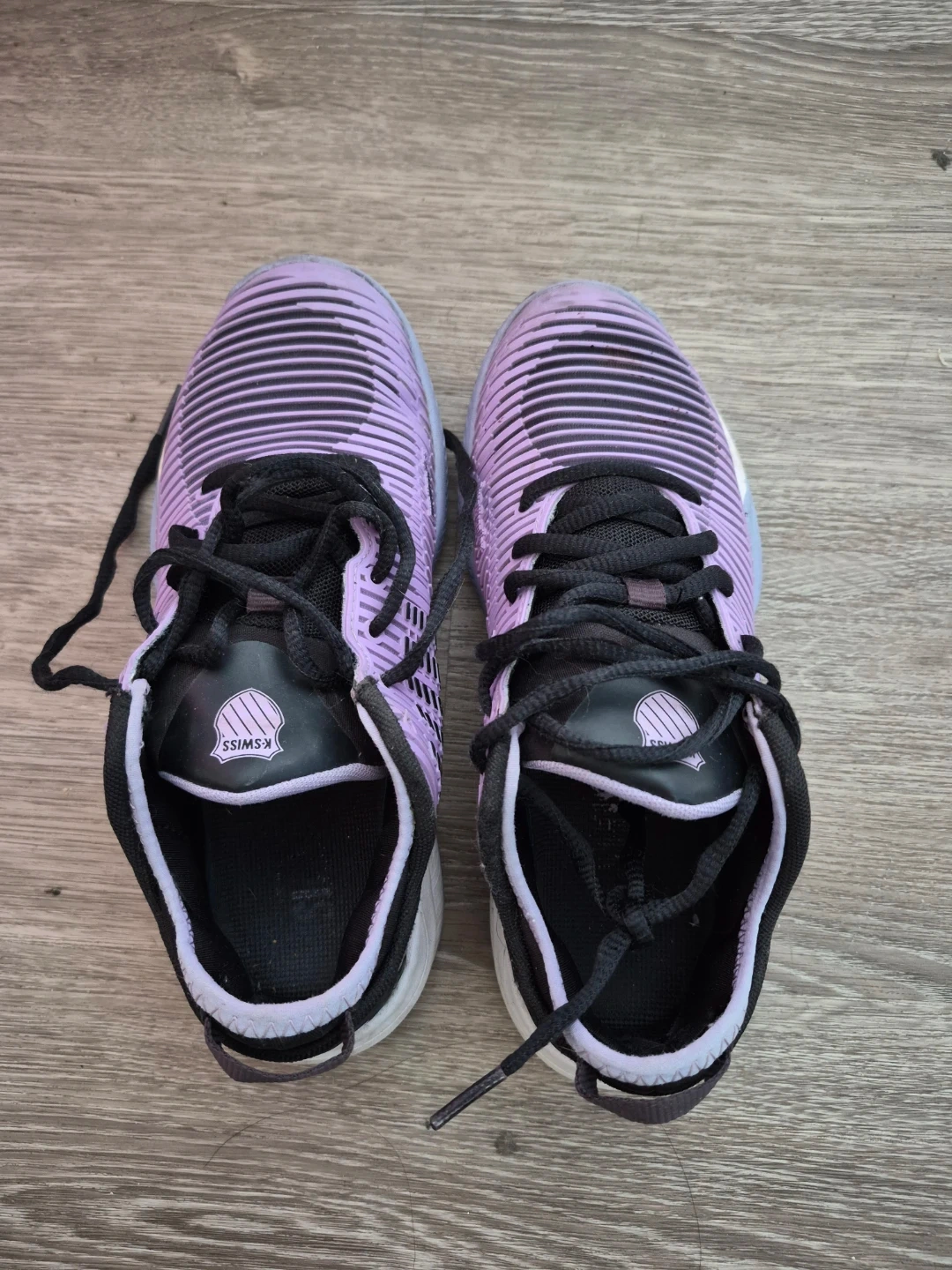 These K-Swiss athletic shoes are a lovely lavender colour with black accents. They have laces for closure and a comfortable design. Size 6.5