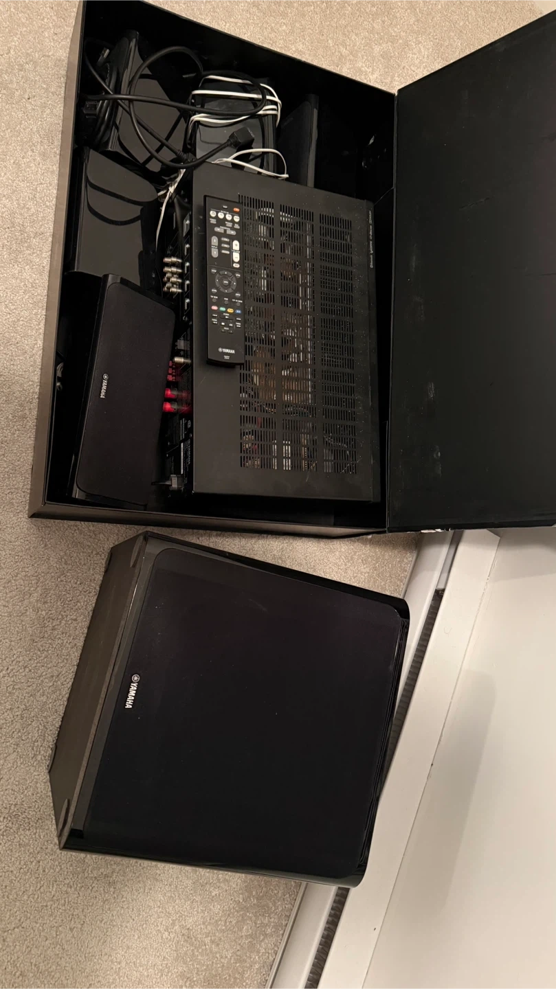Selling a Yamaha home theatre system, complete with a receiver, speakers, and subwoofer. It comes with its original box and remote control. Perfect for setting up a great sound system in your home!
