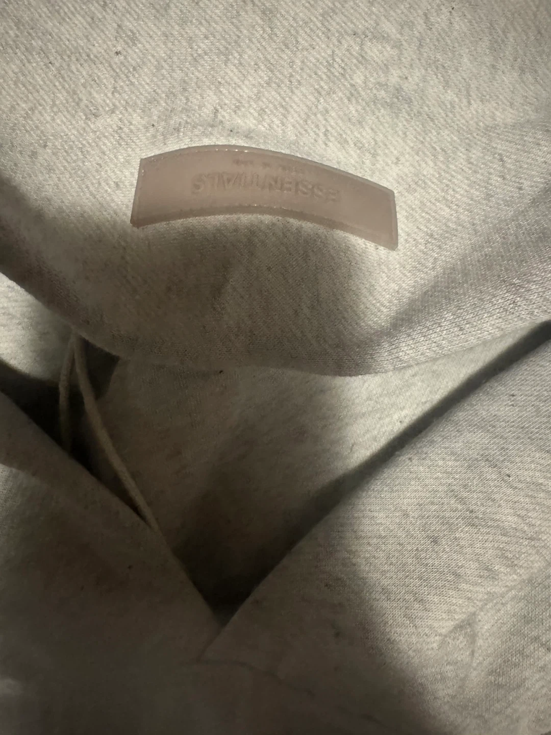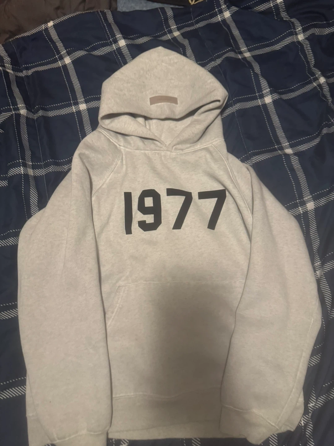 Grey hoodie by Fear of God Essentials with "1977" graphic on the front. It's a pullover style with a front kangaroo pocket and a drawstring hood. Cotton blend material.