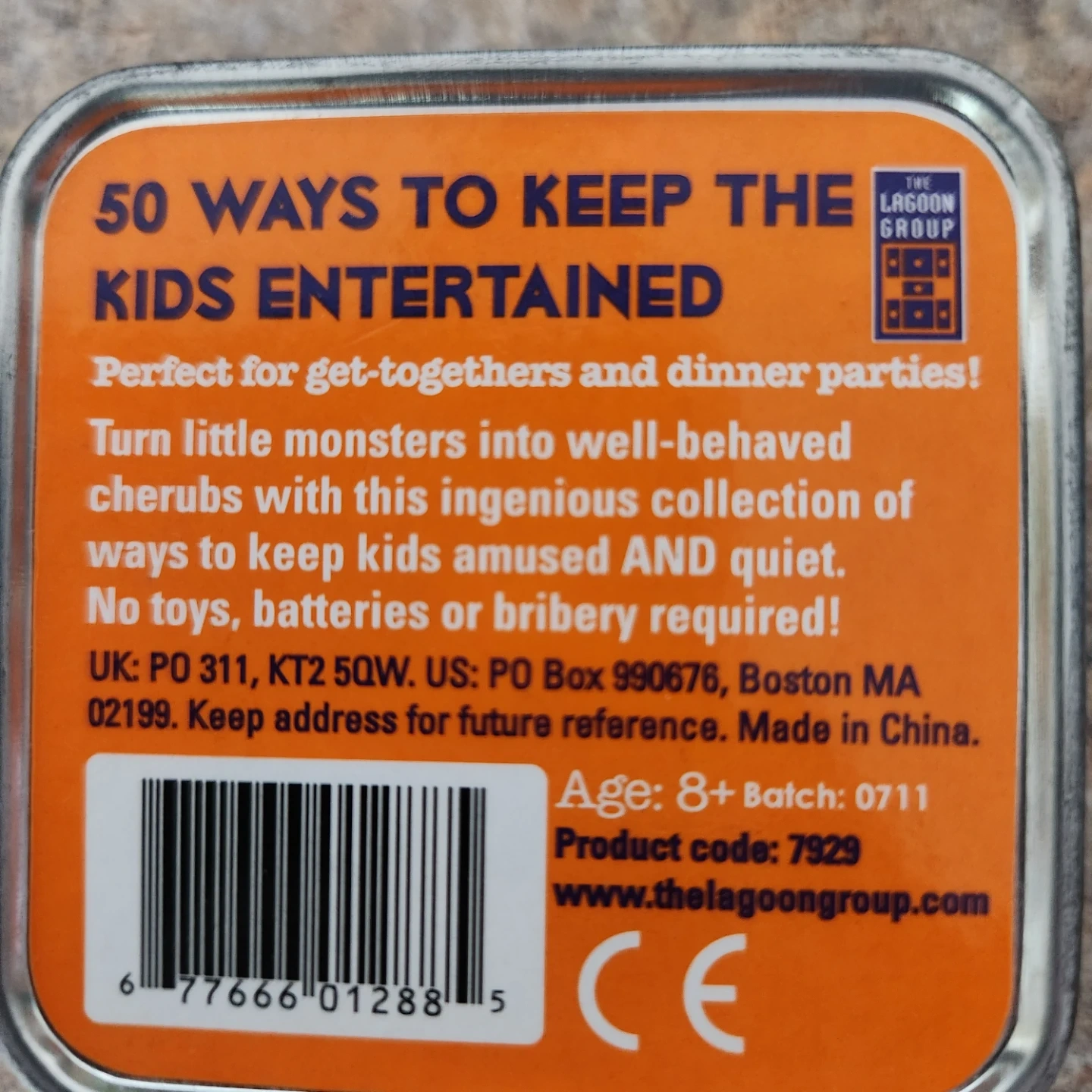 This tin contains 50 ingenious ways to keep kids amused and quiet. No toys, batteries or bribery required! It's suitable for ages 8 and up. This would be useful for parents looking for activities to keep their children occupied. Great for road trips!