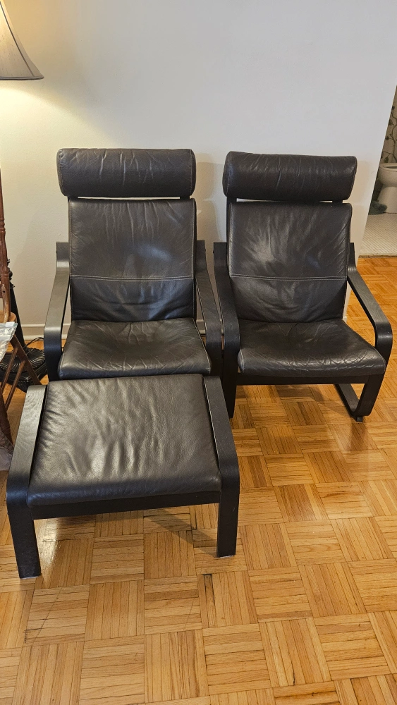 2 Ikea leather arm chairs and 1 footstool (POÄNG)
