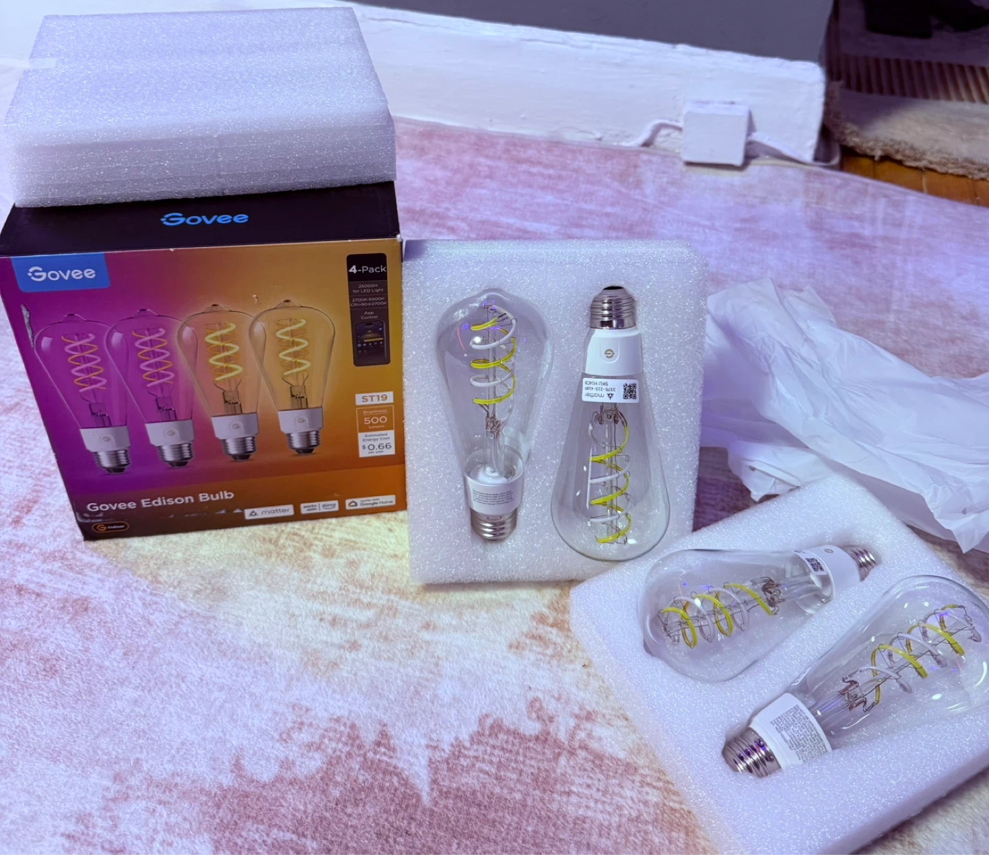 This is a 4-pack of Govee Edison Style LED bulbs. They are ST19 shape and 500 lumens. App control is available with these bulbs.