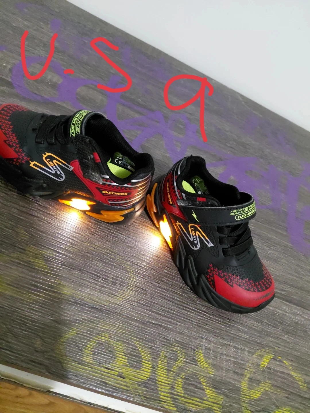 Selling a pair of Skechers light-up sneakers for kids in a size US 9. They're black and red and have a fun, eye-catching design. Perfect for adding some extra flair to your little one's outfit!