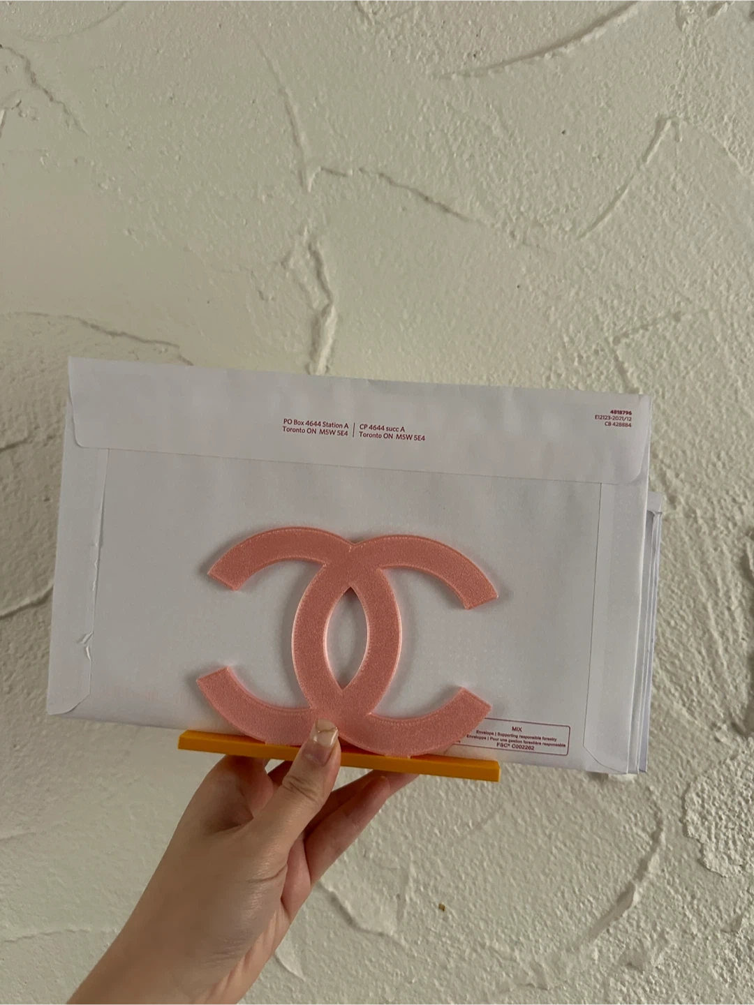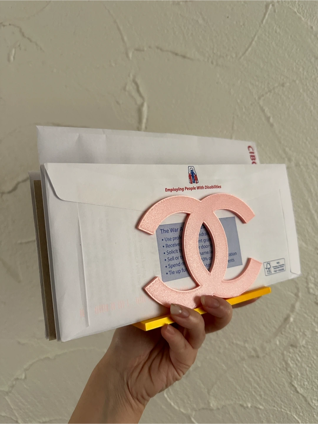 Chic pink glitter Chanel CC logo desk organizer. This piece adds a touch of luxury to any workspace. Perfect for holding mail or small stationery items.
