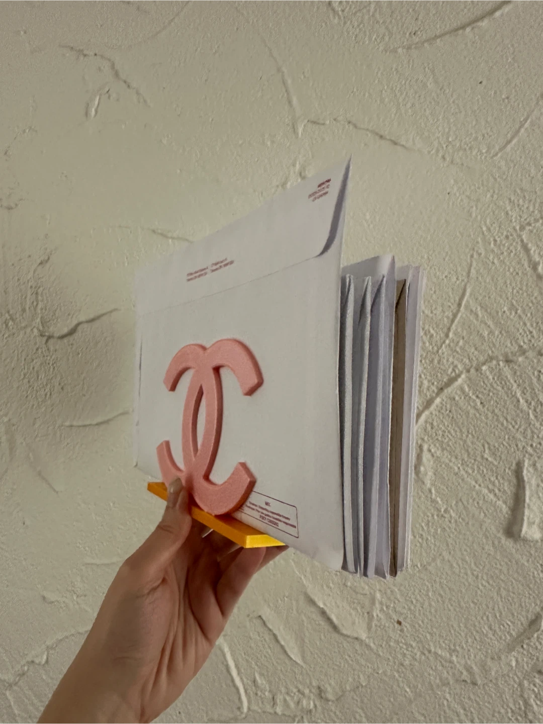 Chic pink glitter Chanel CC logo desk organizer. This piece adds a touch of luxury to any workspace. Perfect for holding mail or small stationery items.