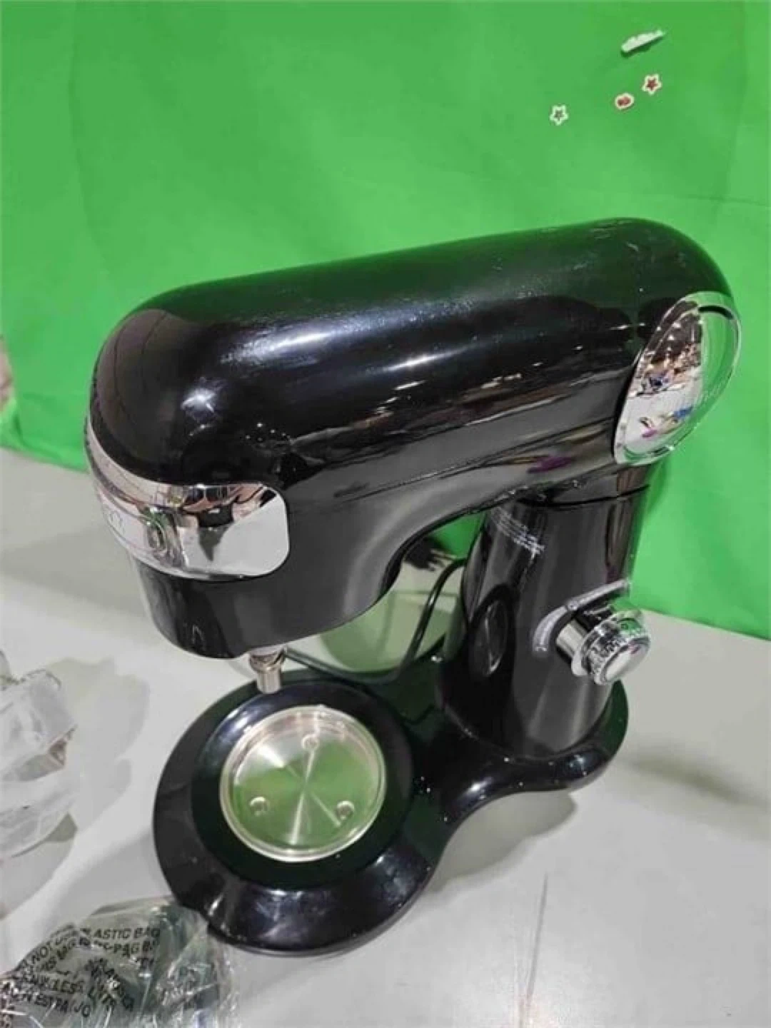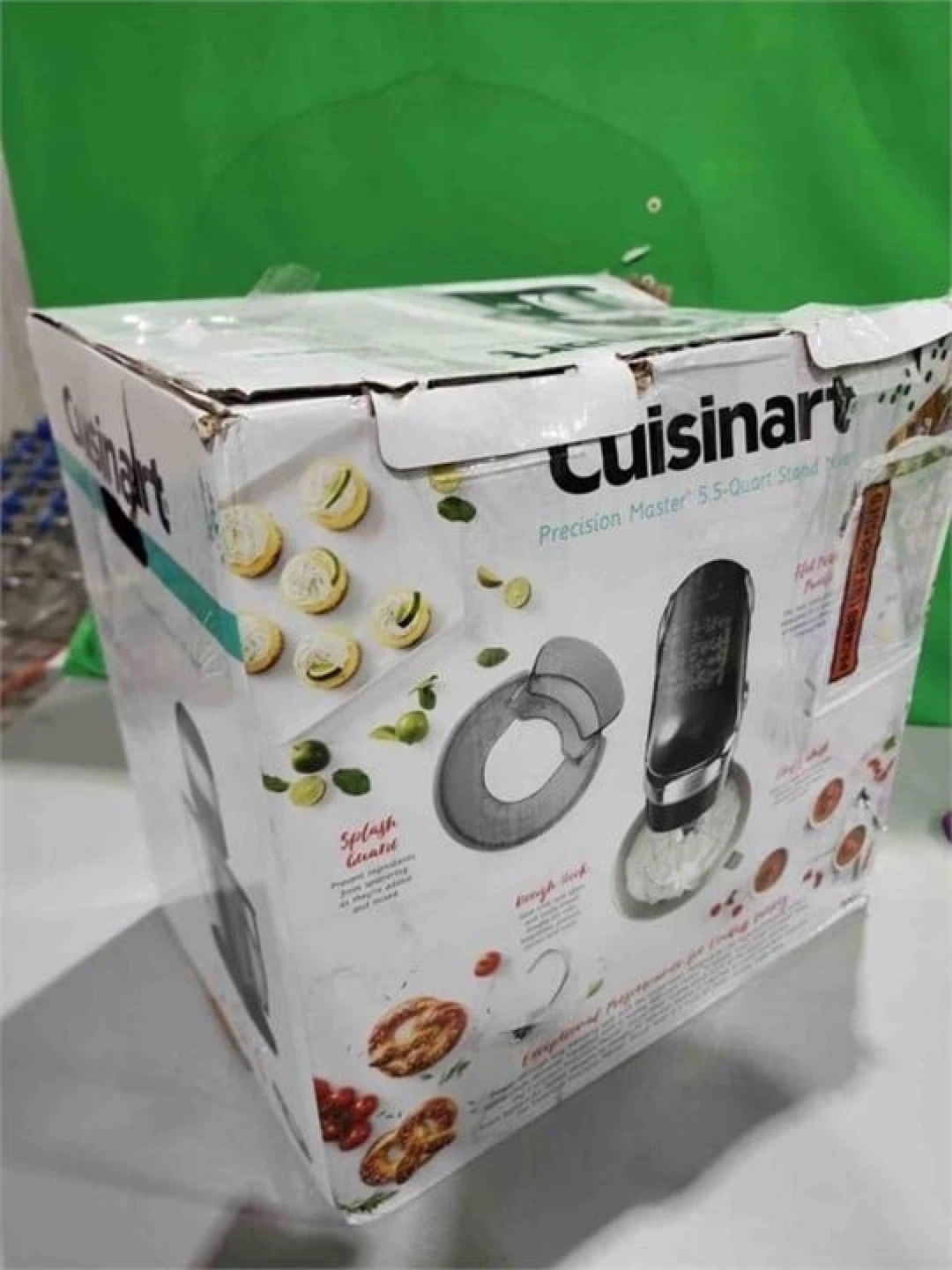 Open box. This Cuisinart Precision Master stand mixer comes in black with a 5.5-quart stainless steel bowl. It features 12 speeds for various mixing needs. Includes attachments for different tasks.