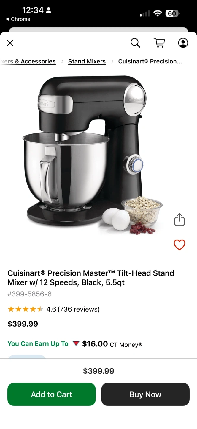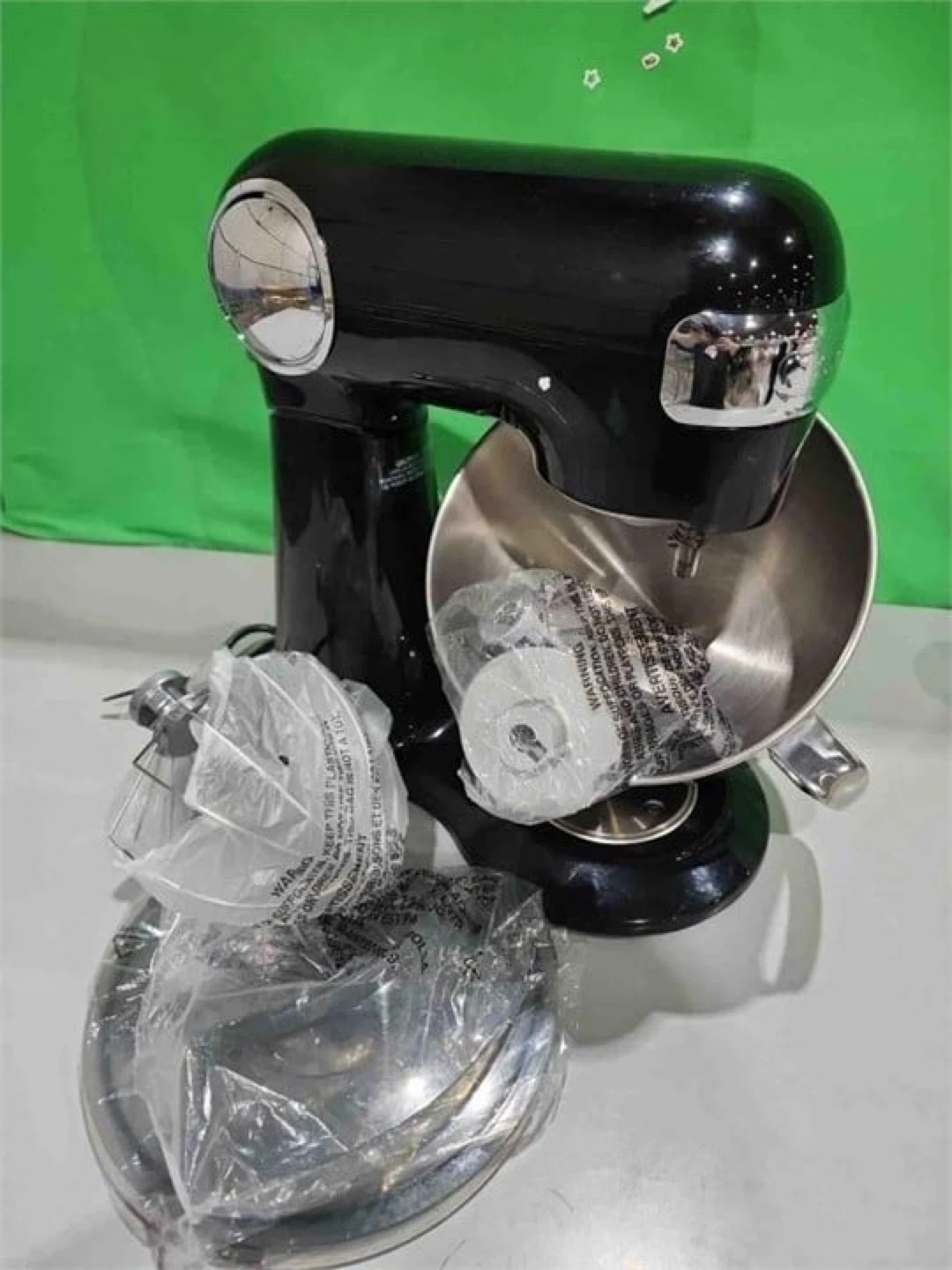 Open box. This Cuisinart Precision Master stand mixer comes in black with a 5.5-quart stainless steel bowl. It features 12 speeds for various mixing needs. Includes attachments for different tasks.