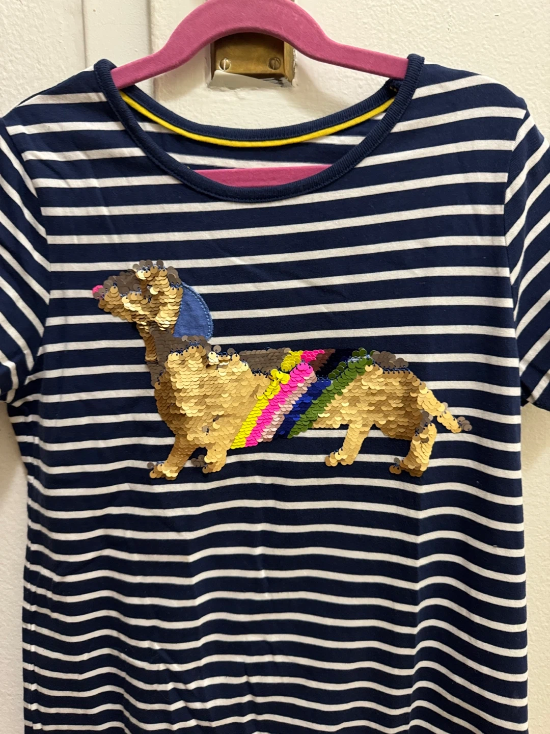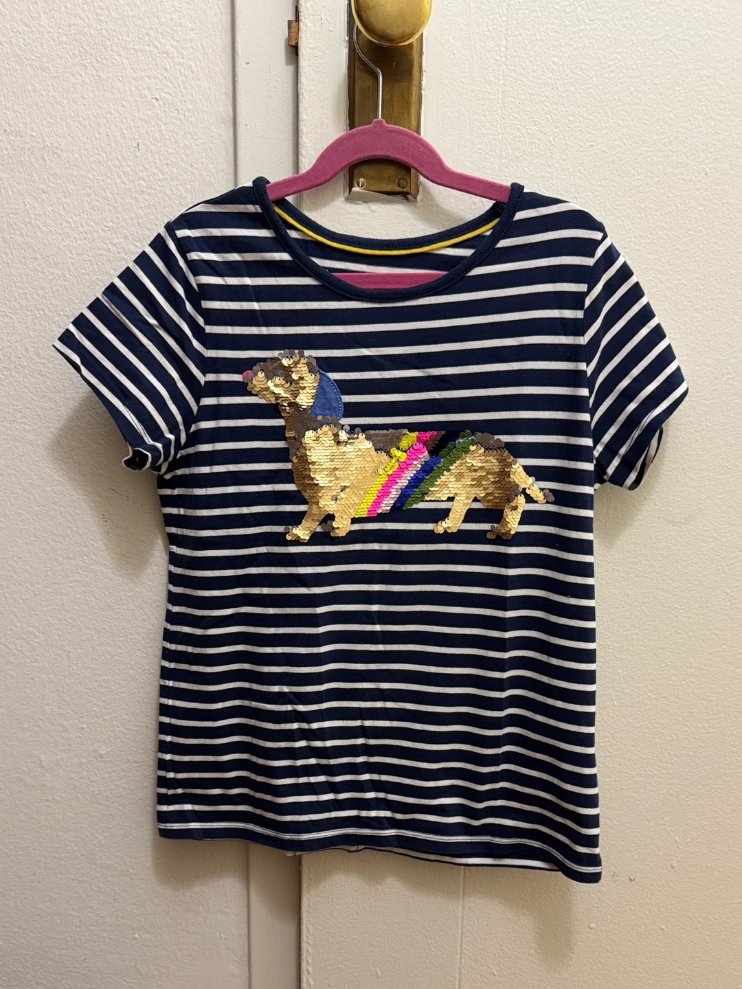 Mini Boden Navy Striped Dachshund Sequin T-Shirt Size 11-12Y