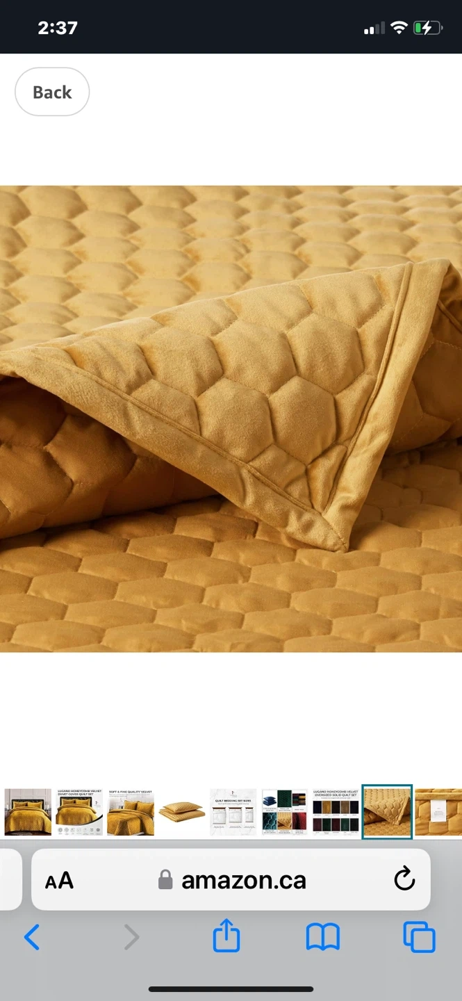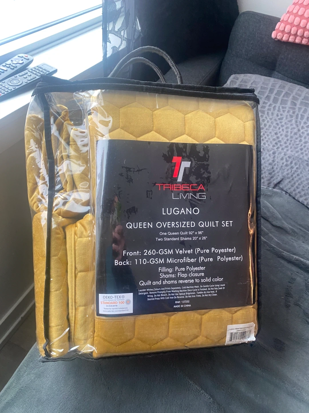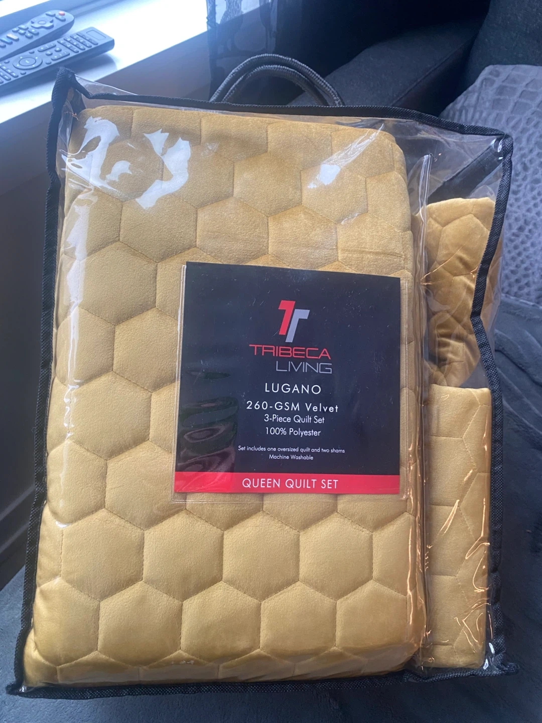 This queen oversized quilt set features a unique honeycomb stitching. It's made with 260-GSM velvet on the front and 110-GSM microfiber on the back. The set includes one quilt and two standard shams.