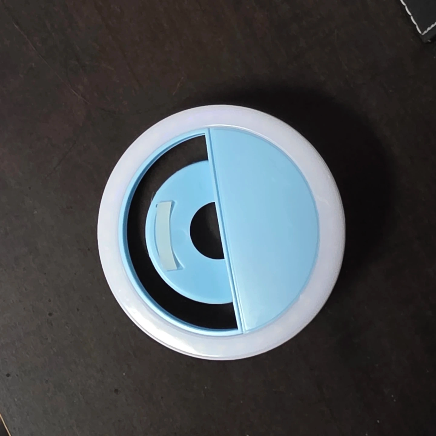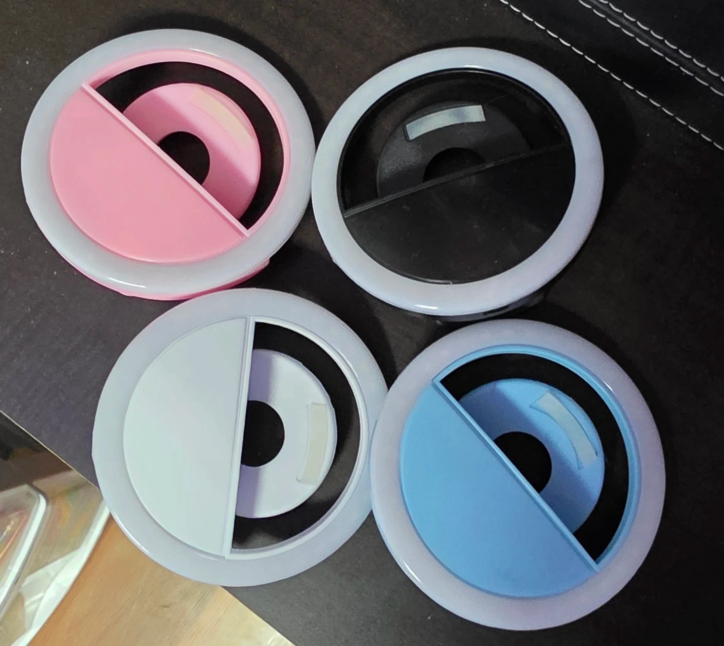 This is a selfie ring light. It clips onto your phone for better lighting. The ring light has LED bulbs that provide bright illumination. It's perfect for taking selfies or videos in low light conditions!