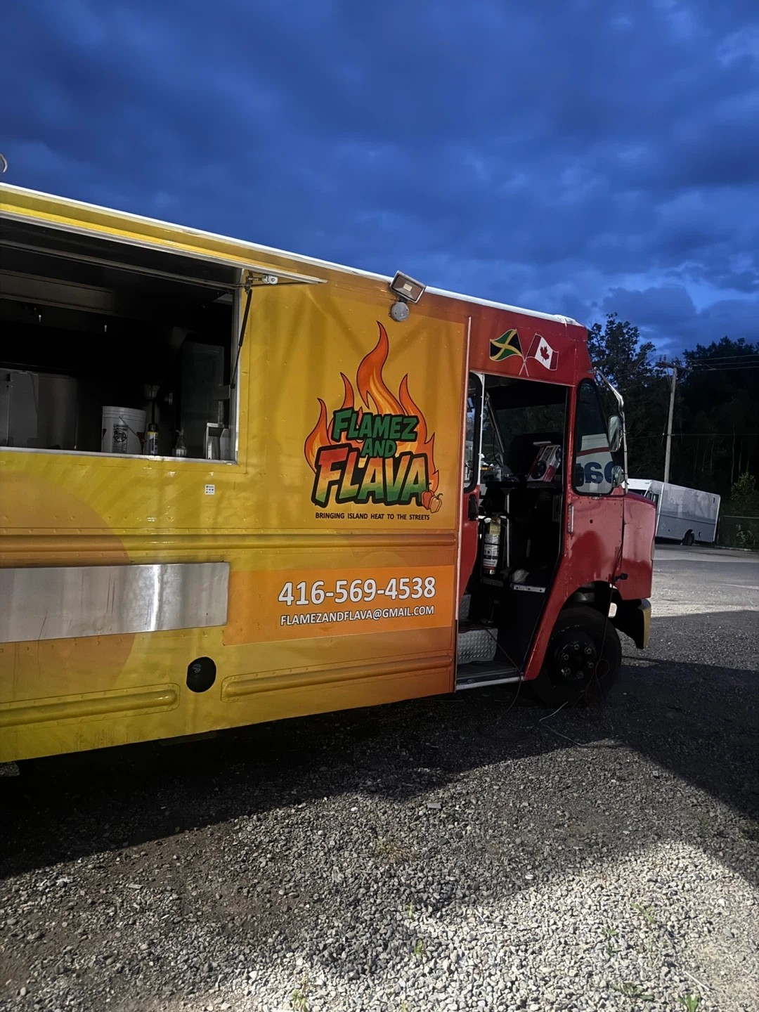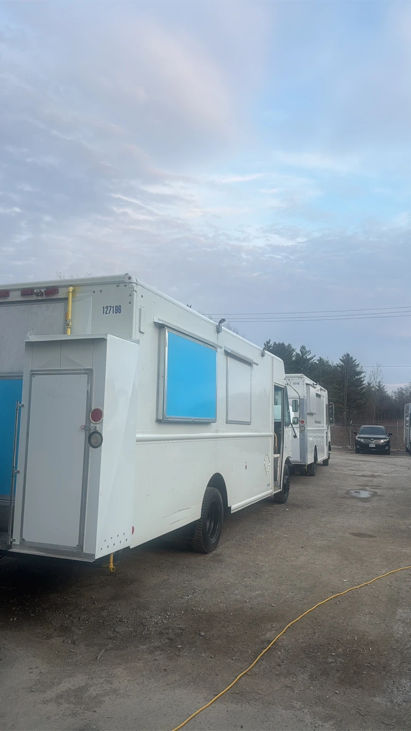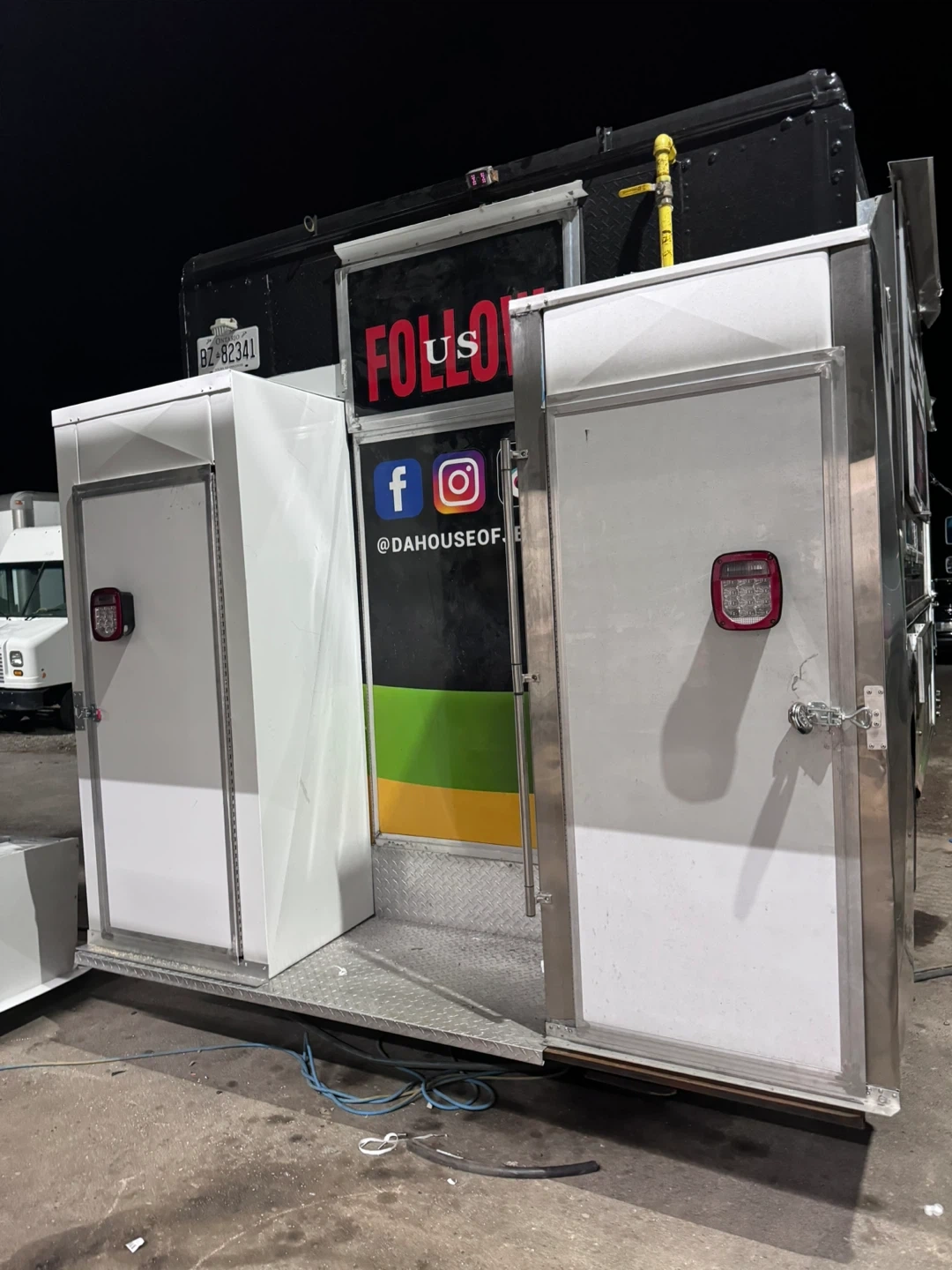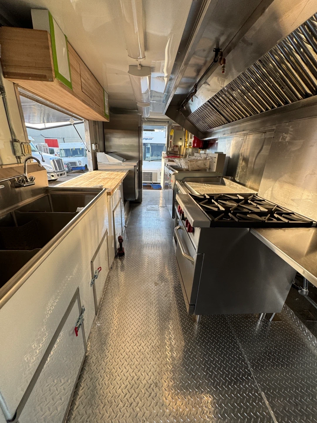 Fully equipped commercial food truck interior with stainless steel surfaces. Features include a multi-compartment sink, stovetop burners, and a griddle. This setup is ready for a mobile food business. Plenty of counter space and storage.