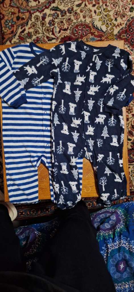 Two baby pajamas for sale. One is blue and white striped, and the other is navy blue with a cute tree and animal pattern. Both are in good condition and ready for a new little one!