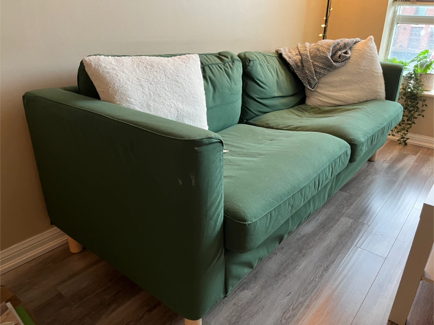 Selling my forest green Karlstad couch from IKEA (discontinued model). Very comfortable and well loved. Small stain on the right arm that can be easily removed (pictured). Covers are removable and machine washable.