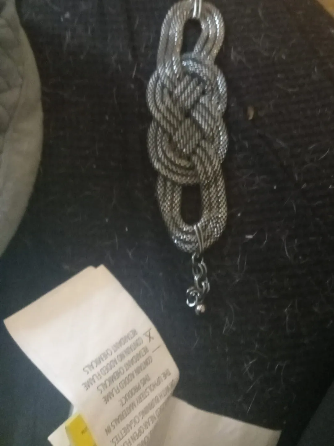 This silver tone bracelet features a woven knot design with a dangling charm. It's made from metal mesh and has a secure clasp. The tag indicates it contains added flame retardant chemicals.