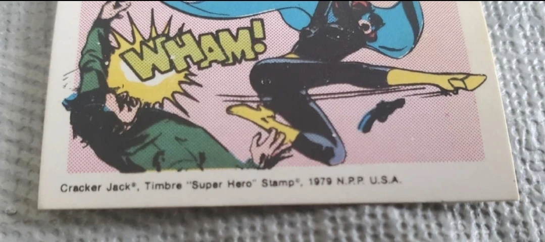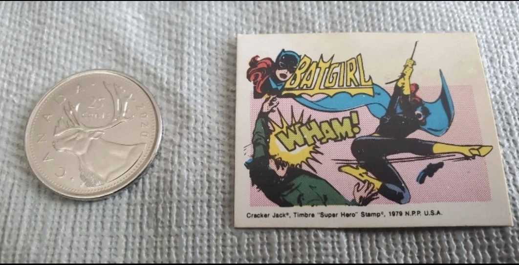Here we have a 1979 cracker jack stamp card of dc comics Batgirl. Adhesive on back has not been used but may have debris because the way they were previously stored. Please see pictures for measurements and condition.