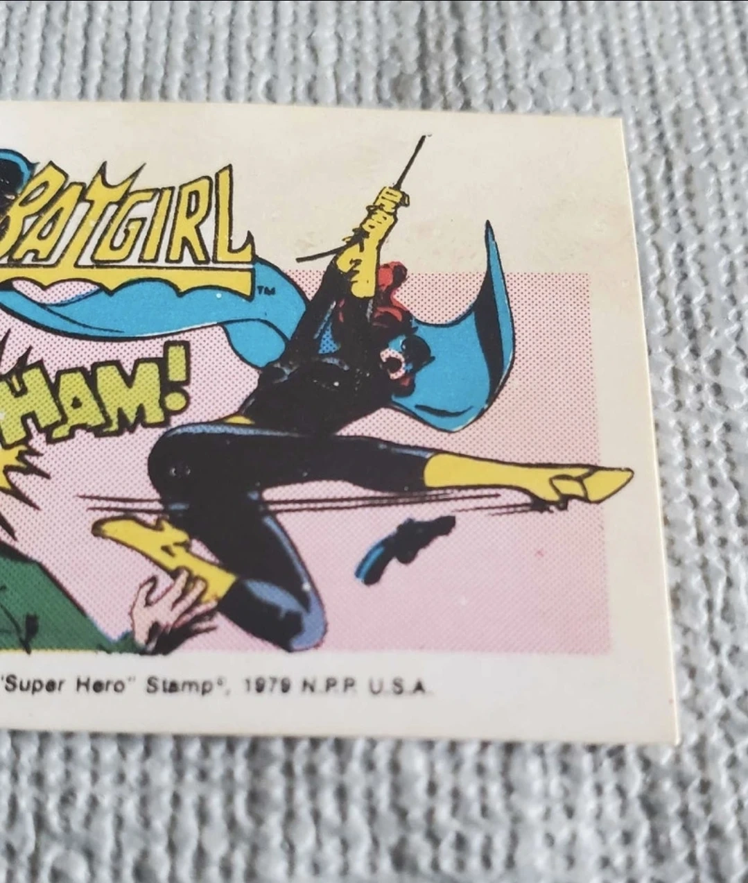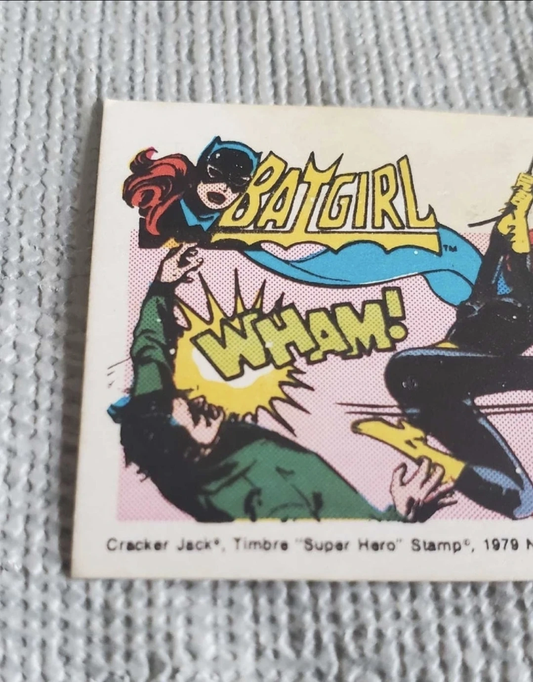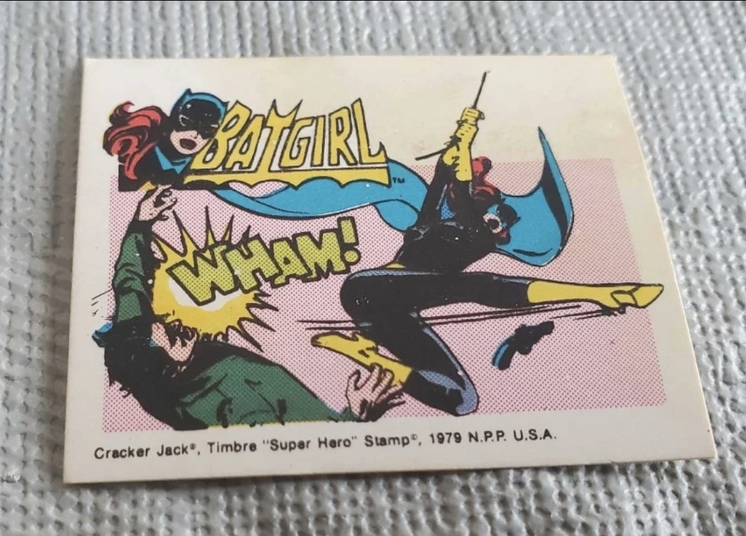 Here we have a 1979 cracker jack stamp card of dc comics Batgirl. Adhesive on back has not been used but may have debris because the way they were previously stored. Please see pictures for measurements and condition.
