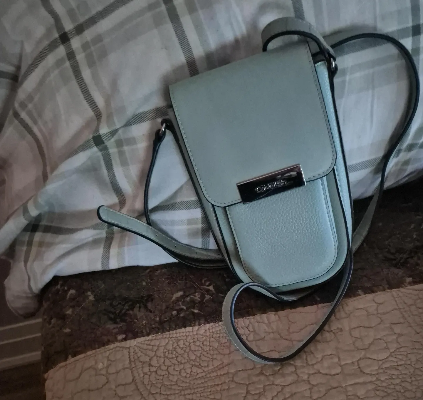 This is a pale blue Calvin Klein crossbody bag. It features a faux leather exterior with a pebbled front flap. It's perfect for carrying your essentials when you're on the go!
