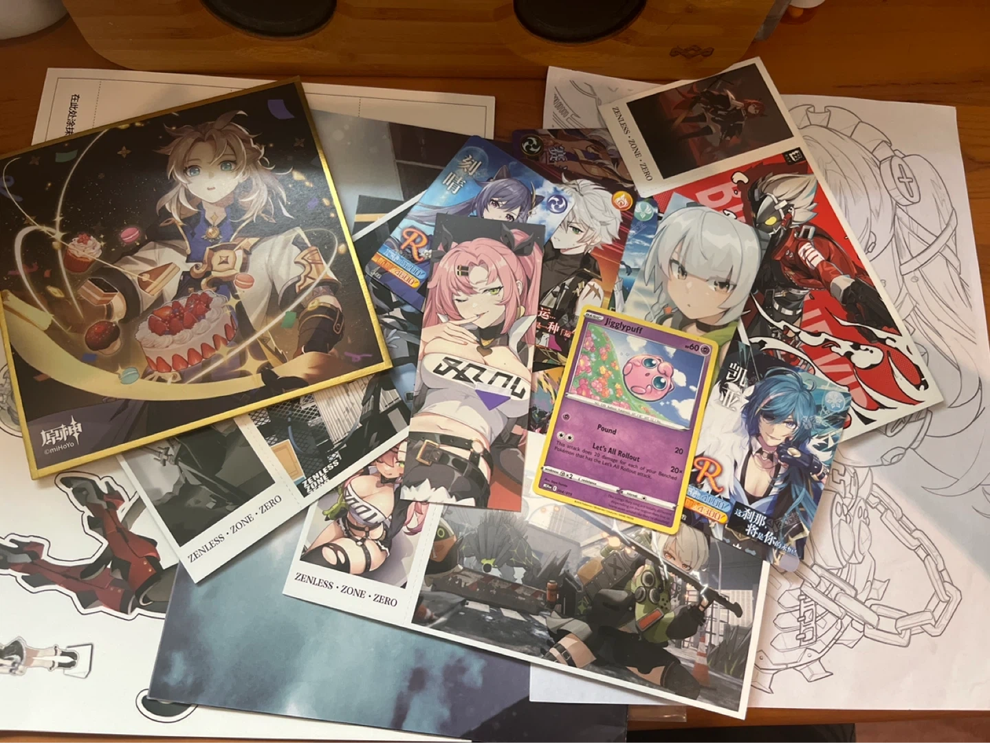 A collection of art prints featuring characters from Genshin Impact and Zenless Zone Zero, along with a Jigglypuff Pokemon card. The Genshin Impact print is from miHoYo and features Albedo. Additional items include various character art cards and stickers.