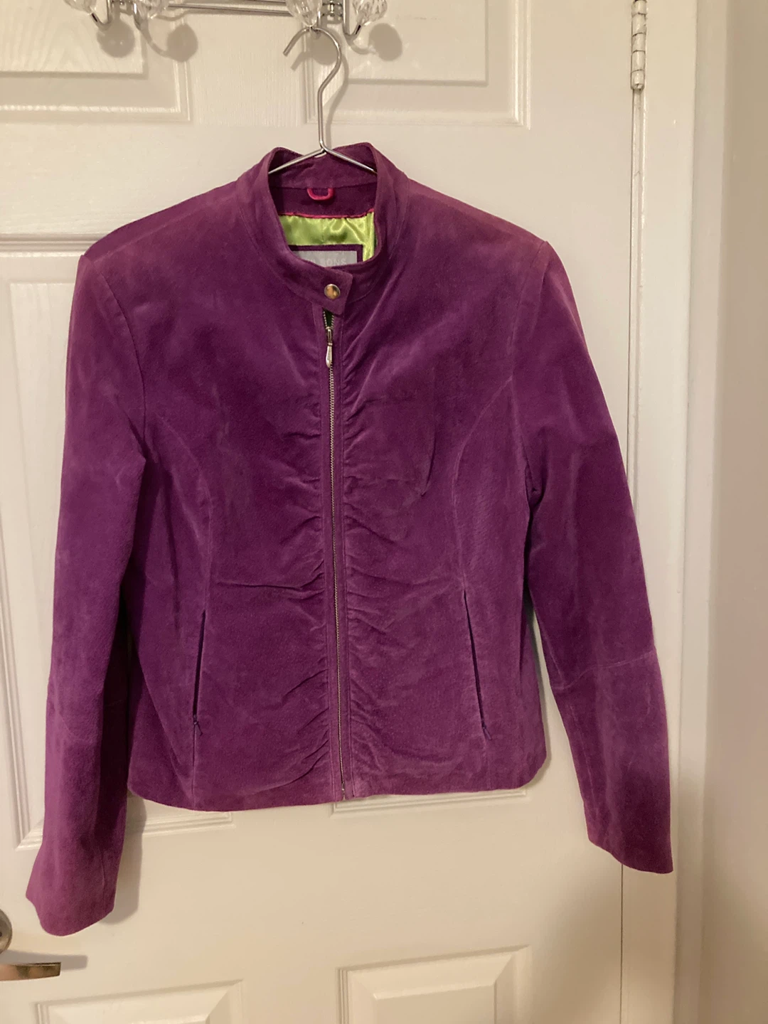 Check out this stylish Wilson's Leather Maxima jacket! It's a lovely purple suede, perfect for adding a pop of colour to your wardrobe. The jacket is a size S and in great condition. It has a unique design with a gathered front and a vibrant green lining. A real statement piece!
