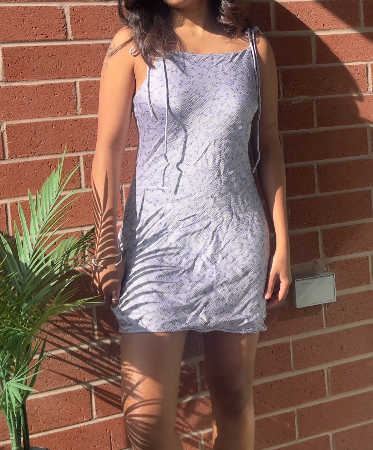 A light purple mini dress with a delicate floral pattern. It features a spaghetti strap design with adjustable tie shoulders. This slip dress style is perfect for warmer weather.