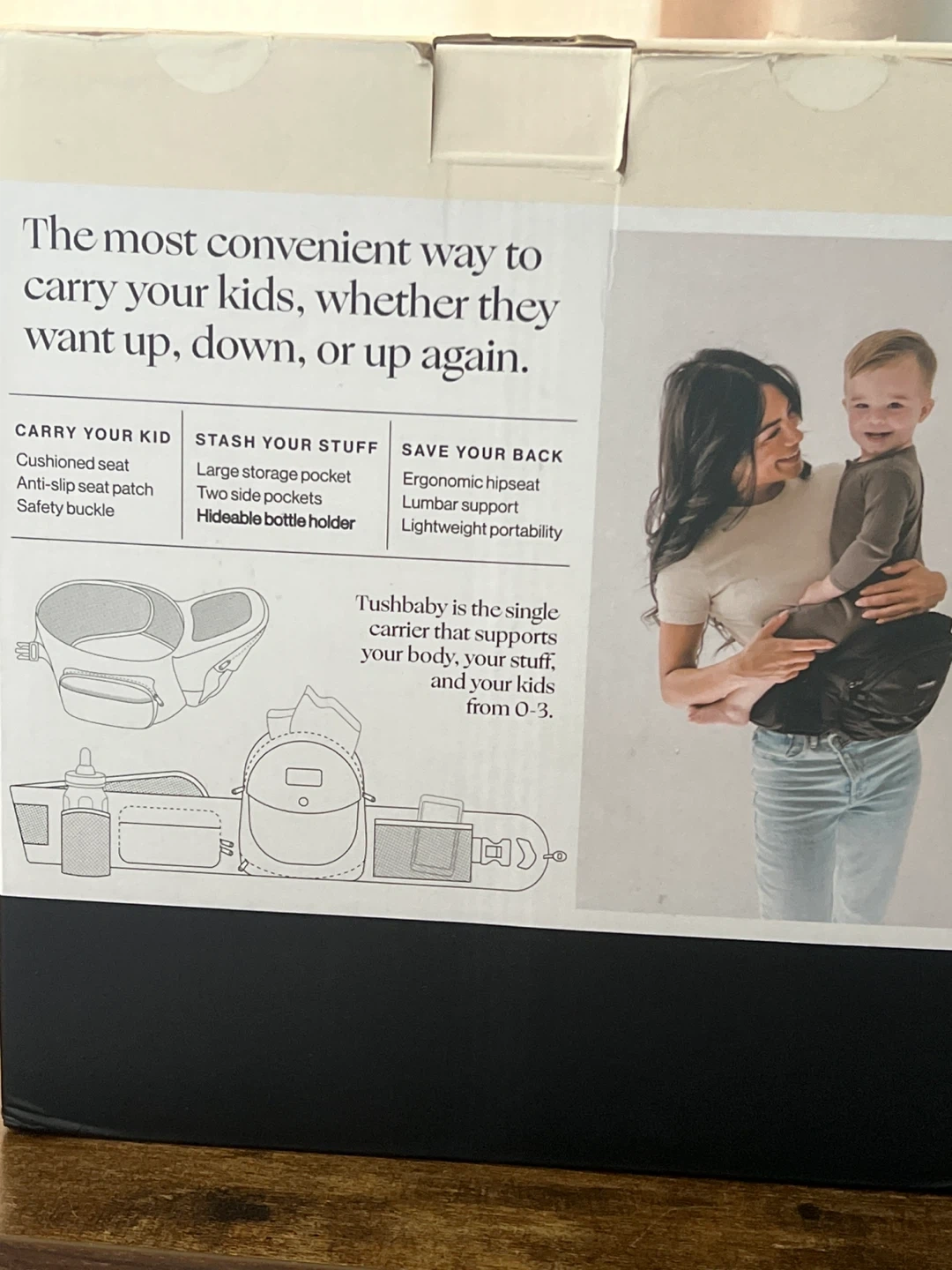 Selling a Tushbaby Strapless Baby Hipseat in black! It's the easy, comfortable way to carry your kids and your things. Great from infancy up to age 3. It has a cushioned seat, anti-slip seat patch, and a safety buckle. There's also a large storage pocket and two side pockets. The ergonomic hipseat provides lumbar support and lightweight portability. The box is included!
