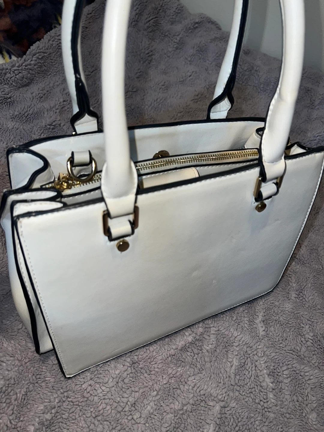 🤍 White handbag with gold zipper details and both top handle + long shoulder strap.