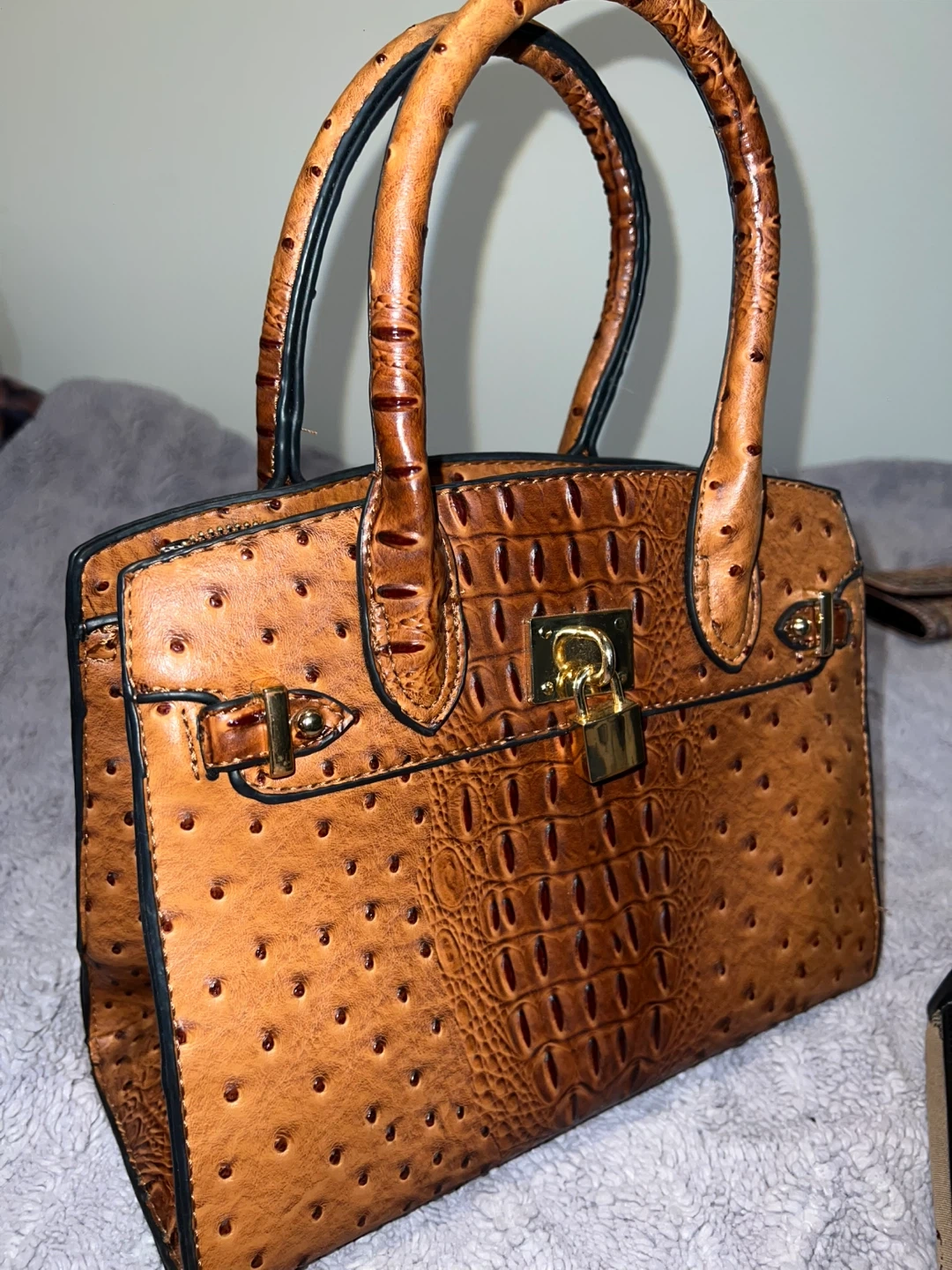 🤎 Brown croc ostrich textured handbag with gold lock detail and structured shape.
