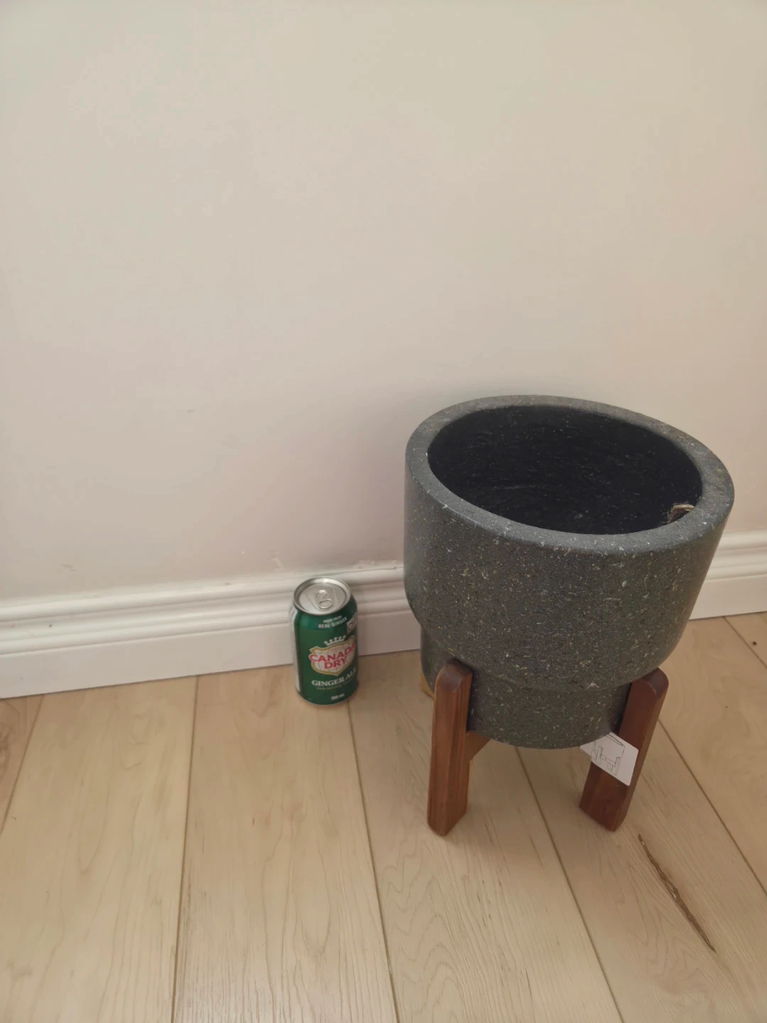 A speckled grey planter pot comes with a wooden stand. It's made in Vietnam and has a unique textured finish. This pot's design makes it suitable for any indoor plant.